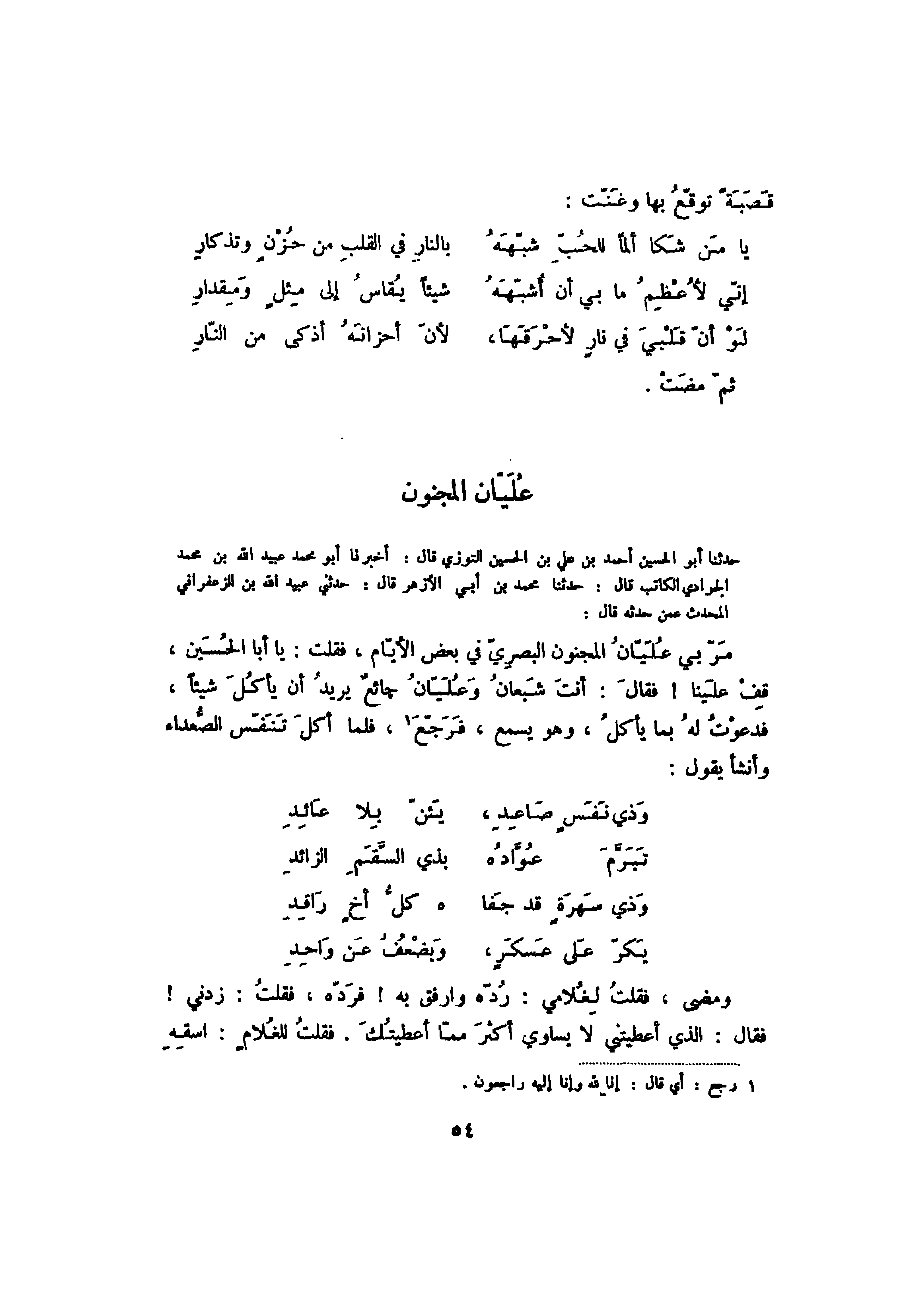 حدثنا أبو الحسين أحمد بن علي بن الحسين التوزي قال: أخبرنا أبو محمد عبيد الله بن محمد الجرادي الكاتب قال: حدثنا محمد بن أبي الأزهر قال: حدثني عبيد الله بن الزعفراني المحدث عمن حدثه قال: مر بي عليان المجنون البصري في بعض الأيام، فقلت: يا أبا الحسين، قف علينا! فقال: أنت شبعان وعليان جائع يريد أن يأكل شيئاً، فدعوت له بما يأكل، وهو يسمع، فرجع، فلما أكل تنفس الصعداء وأنشأ يقول:
