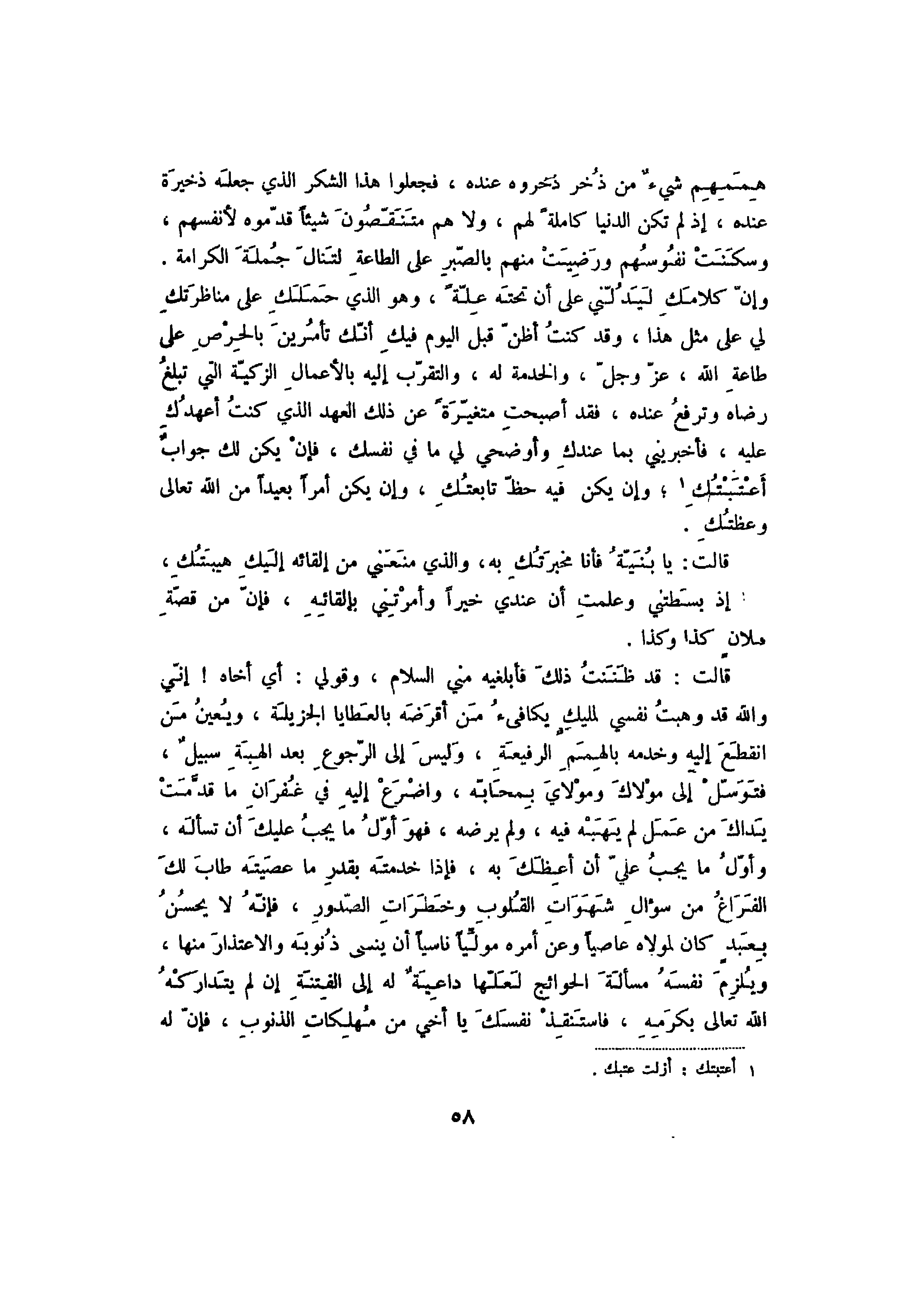 هممهم شيء من ذخر ذخروه عنده، فجعلوا هذا الشكر الذي جعله ذخيرة عنده، إذ لم تكن الدنيا كاملة لهم، ولا هم متنقصون شيئاً قدموه لأنفسهم، وسكنت نفوسهم ورضيت منهم بالصبر على الطاعة لتنال جملة الكرامة، وإن كلامك ليدلني على أن تحته علةً، وهو الذي حملك على مناظرتك لي على مثل هذا، وقد كنت أظن قبل اليوم فيك أنك تأمرين بالحرص على طاعة الله، عز وجل، والخدمة له، والتقرب إليه بالأعمال الزكية التي تبلغ رضاه وترفع عنده فقد أصبحت متغيرة عن ذلك العهد الذي كنت أعهدك عليه، فأخبريني بما عندك وأوضحي لي ما في نفسك، فإن يكن لك جواب أعتبتك، وإن يكن فيه حظ تابعتك، وإن يكن أمراً بعيداً من الله تعالى وعظتك.