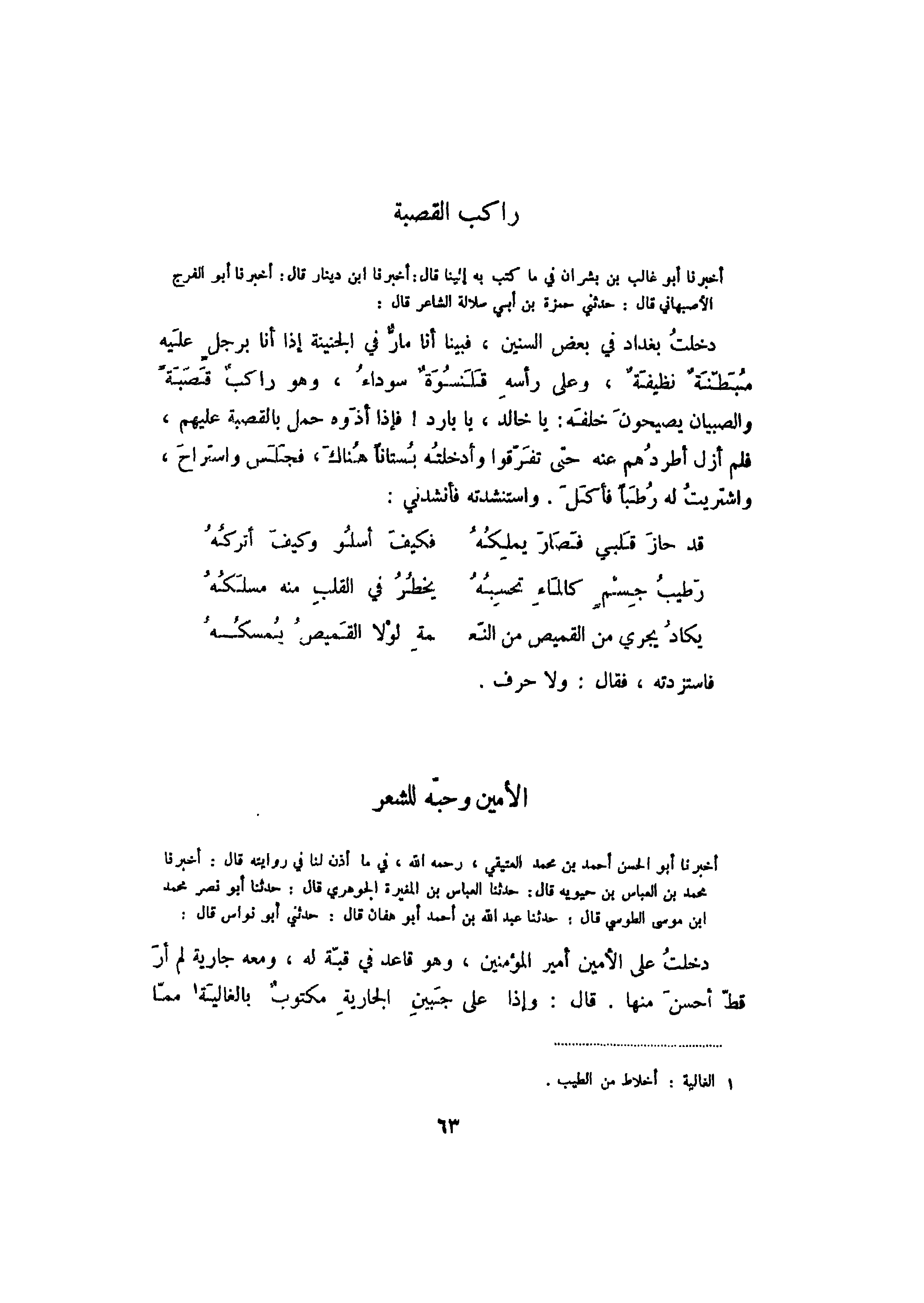 أخبرنا أبو الحسن أحمد بن محمد العتيقي، رحمه الله، في ما أذن لنا في روايته قال: أخبرنا محمد بن العباس بن حيويه قال: حدثنا العباس بن المغيرة الجوهري قال: حدثنا أبو نصر محمد بن موسى الطوسي قال: حدثنا عبد الله بن أحمد أبو هفان قال: حدثني أبو نواس قال: دخلت على الأمين أمير المؤمنين، وهو قاعد في قبة له، ومعه جارية لم أر قط أحسن منها. قال: وإذا على جبين الجارية مكتوب بالغالية مما