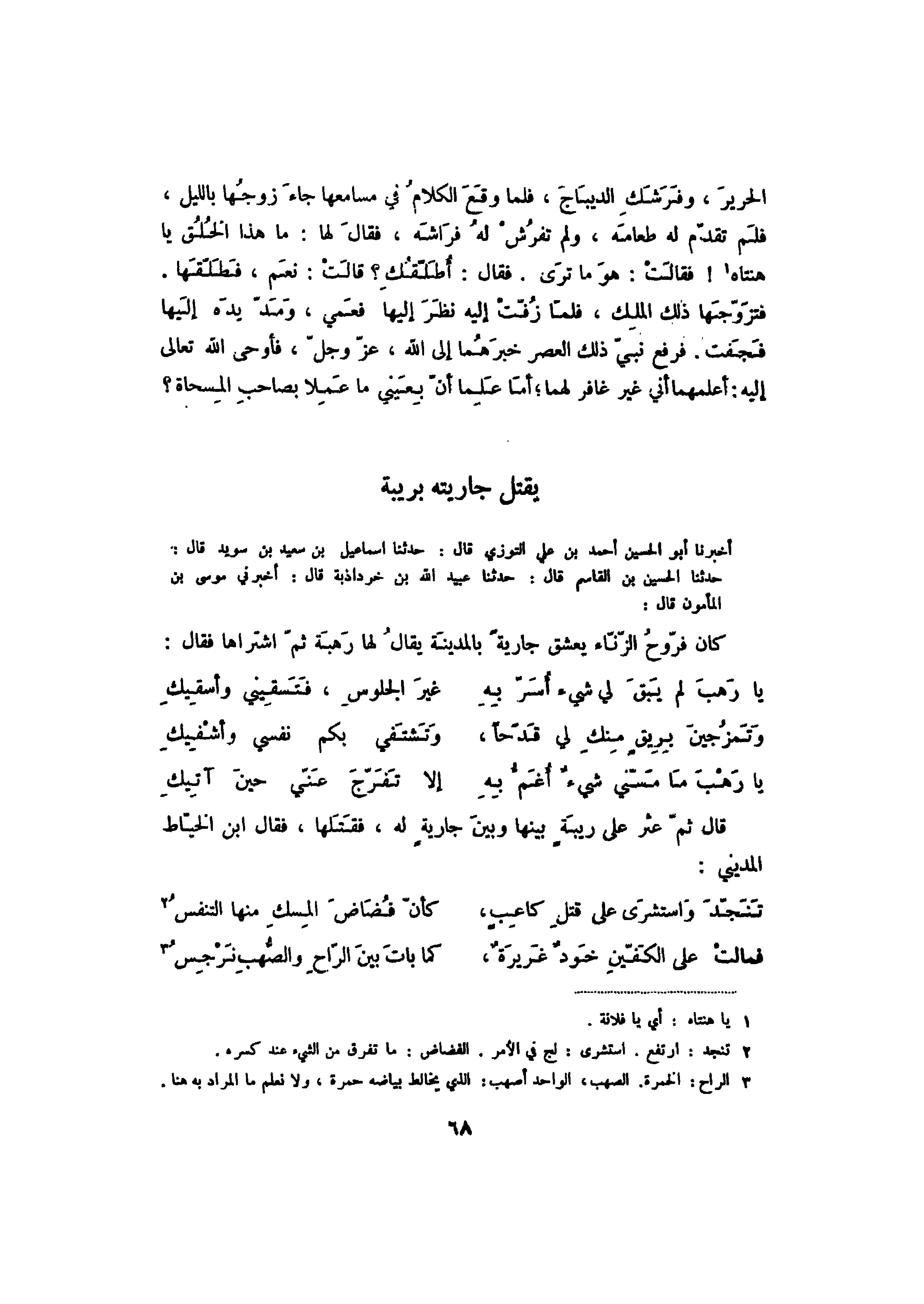 أخبرنا أبو الحسين أحمد بن علي التوزي قال: حدثنا إسماعيل بن سعيد بن سويد قال: حدثنا الحسين بن القاسم قال: حدثنا عبيد الله بن خرداذبة قال: أخبرني موسى بن المأمون قال: كان فروح الزناء يعشق جاريةً بالمدينة يقال لها رهبة ثم اشتراها فقال: