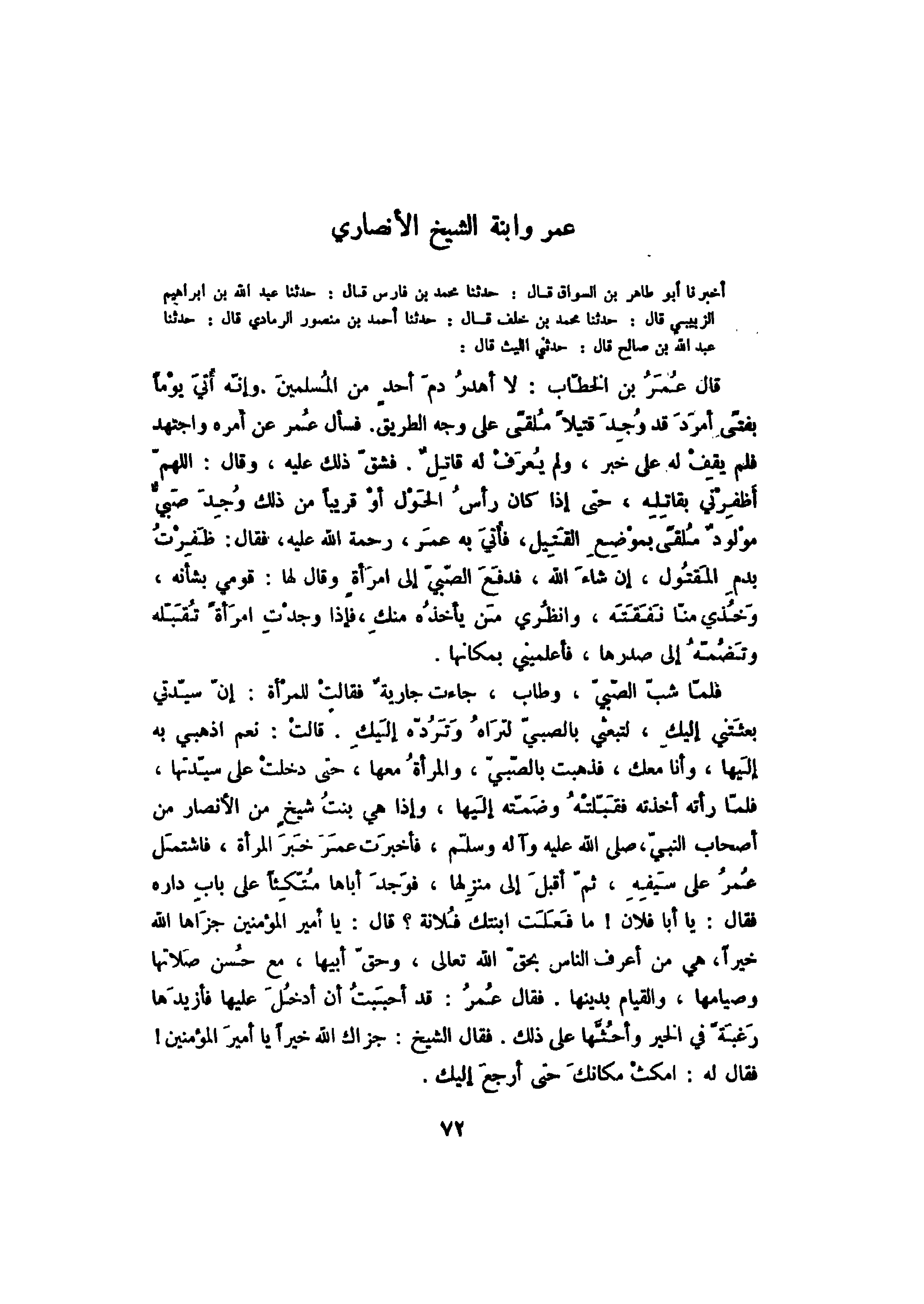 أخبرنا أبو طاهر بن السواق قال: حدثنا محمد بن فارس قال: حدثنا عبد الله بن إبراهيم الزبيبي قال: حدثنا محمد بن خلف قال: حدثنا أحمد بن منصور الرمادي قال: حدثنا عبد الله بن صالح قال: حدثني الليث قال: قال عمر بن الخطاب: لا أهدر دم أحد من المسلمين. وإنه أتي يوماً بفتىً أمرد قد وجد قتيلاً ملقىً على وجه الطريق. فسأل عمر عن أمره واجتهد فلم يقف له على خبر، ولم يعرف له قاتل. فشق ذلك عليه، وقال: اللهم أظفرني بقاتله، حتى إذا كان رأس الحول أو قريباً من ذلك وجد صبي مولود ملقىً بموضع القتيل، فأتي به عمر، رحمة الله عليه، فقال: ظفرت بدم المقتول، إن شاء الله، فدفع الصبي إلى امرأة وقال لها: قومي بشأنه، وخذي منا نفقته، وانظري من يأخذه منك، فإذا وجدت امرأة تقبله وتضمه إلى صدرها، فأعلميني بمكانها.