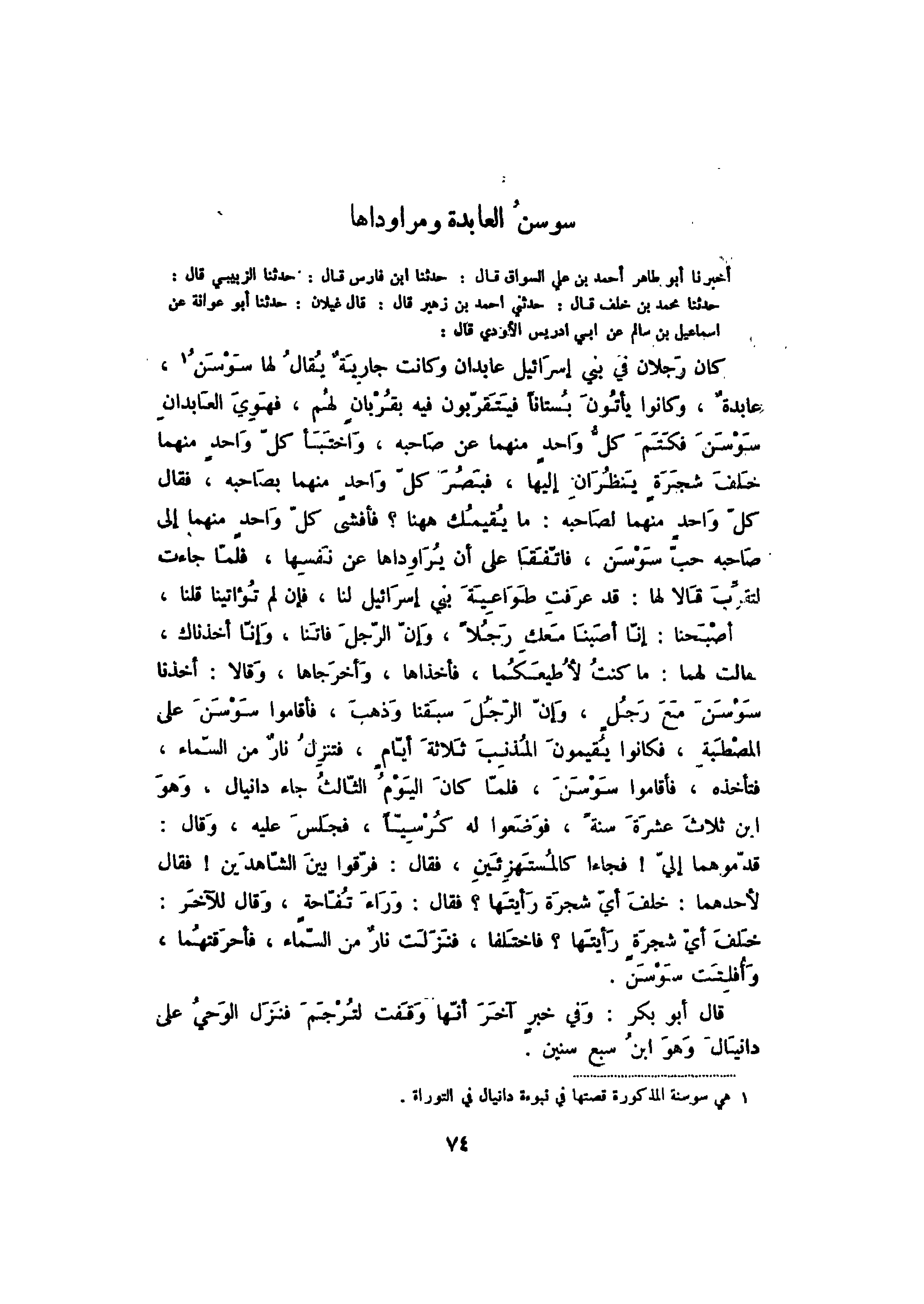 أخبرنا أبو طاهر أحمد بن علي السواق قال: حدثنا ابن فارس قال: حدثنا الزبيبي قال: حدثنا محمد بن خلف قال: حدثني أحمد بن زهير قال: قال غيلان: حدثنا أبو عوانة عن إسماعيل بن سالم عن أبي إدريس الأودي قال: كان رجلان في بني إسرائيل عابدان وكانت جارية يقال لها سوسن، عابدةٌ، وكانوا يأتون بستاناً فيتقربون فيه بقربان لهم، فهوي العابدان سوسن فكتم كل واحد منهما عن صاحبه، واختبأ كل واحد منهما خلف شجرة ينظران إليها، فبصر كل واحد منهما بصاحبه، فقال كل واحد منهما لصاحبه: ما يقيمك ههنا؟ فأفشى كل واحد منهما إلى صاحبه حب سوسن، فاتفقا على أن يراوداها عن نفسها، فلما جاءت لتقرب قالا لها: قد عرفت طواعية بني إسرائيل بني إسرائيل لنا، فإن لم تؤاتينا قلنا، أصبحنا: إنا أصبنا معك رجلاً، وإن الرجل فاتنا، وإنا أخذناك، فقالت لهما: ما كنت لأطيعكما، فأخذاها، وأخرجاها، وقالا: أخذنا سوسن مع رجل، وإن الرجل سبقنا وذهب، فأقاموا سوسن على المصطبة، فكانوا يقيمون المذنب ثلاثة أيام، فتنزل نار من السماء، فتأخذه، فأقاموا سوسن، فلما كان اليوم الثالث جاء دانيال، وهو ابن ثلاث عشرة سنةً، فوضعوا له كرسياً، فجلس عليه، وقال: قدموهما إلي! فجاءا كالمستهزئين، فقال: فرقوا بين الشاهدين! قال لأحدهما: خلف أي شجرة رأيتها؟ فقال: وراء تفاحة، وقال للآخر: خلف أي شجرة رأيتها؟ فاختلفا، فنزلت نار من السماء، فأحرقتهما، وأفلتت سوسن.