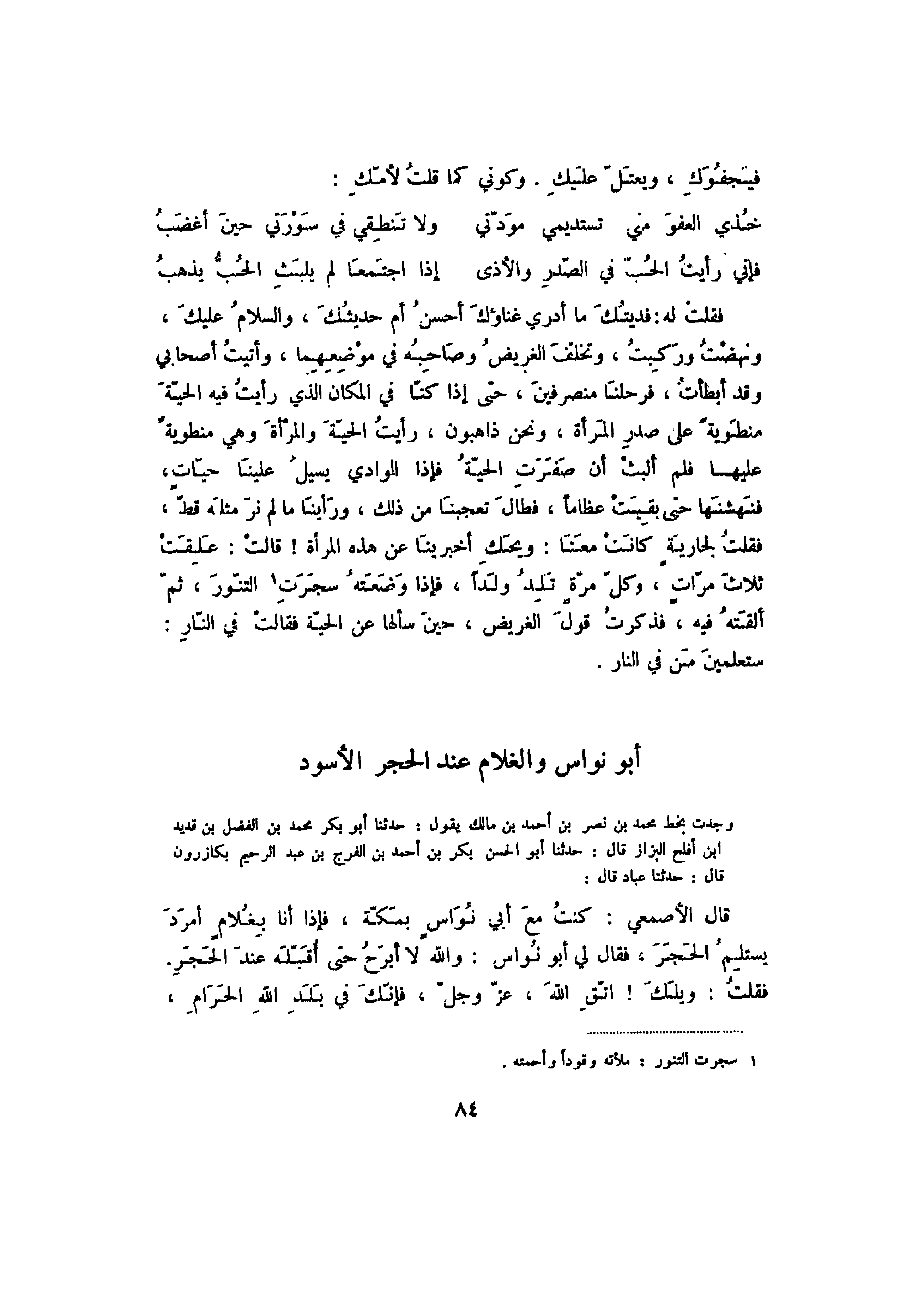 فقلت له: فديتك ما أدري غناؤك أحسن أم حديثك، والسلام عليك، ونهضت وركبت، وتخلف الغريض وصاحبه في موضعهما، وأتيت أصحابي وقد أبطأت، فرحلنا منصرفين، حتى إذا كنا في المكان الذي رأيت فيه الحية منطويةً على صدر المرأة، ونحن ذاهبون، رأيت الحية والمرأة وهي منطوية عليها فلم ألبث أن صفرت الحية فإذا الوادي يسيل علينا حيات، فنهشنها حتى بقيت عظاماً، فطال تعجبنا من ذلك، ورأينا ما لم نر مثله قط، فقلت لجارية كانت معنا: ويحك أخبرينا عن هذه المرأة! قالت: علقت ثلاث مرات، وكل مرة تلد ولداً، فإذا وضعته سجرت التنور، ثم ألقته فيه، فذكرت قول الغريض، حين سألها عن الحية فقالت في النار ستعلمين من في النار.