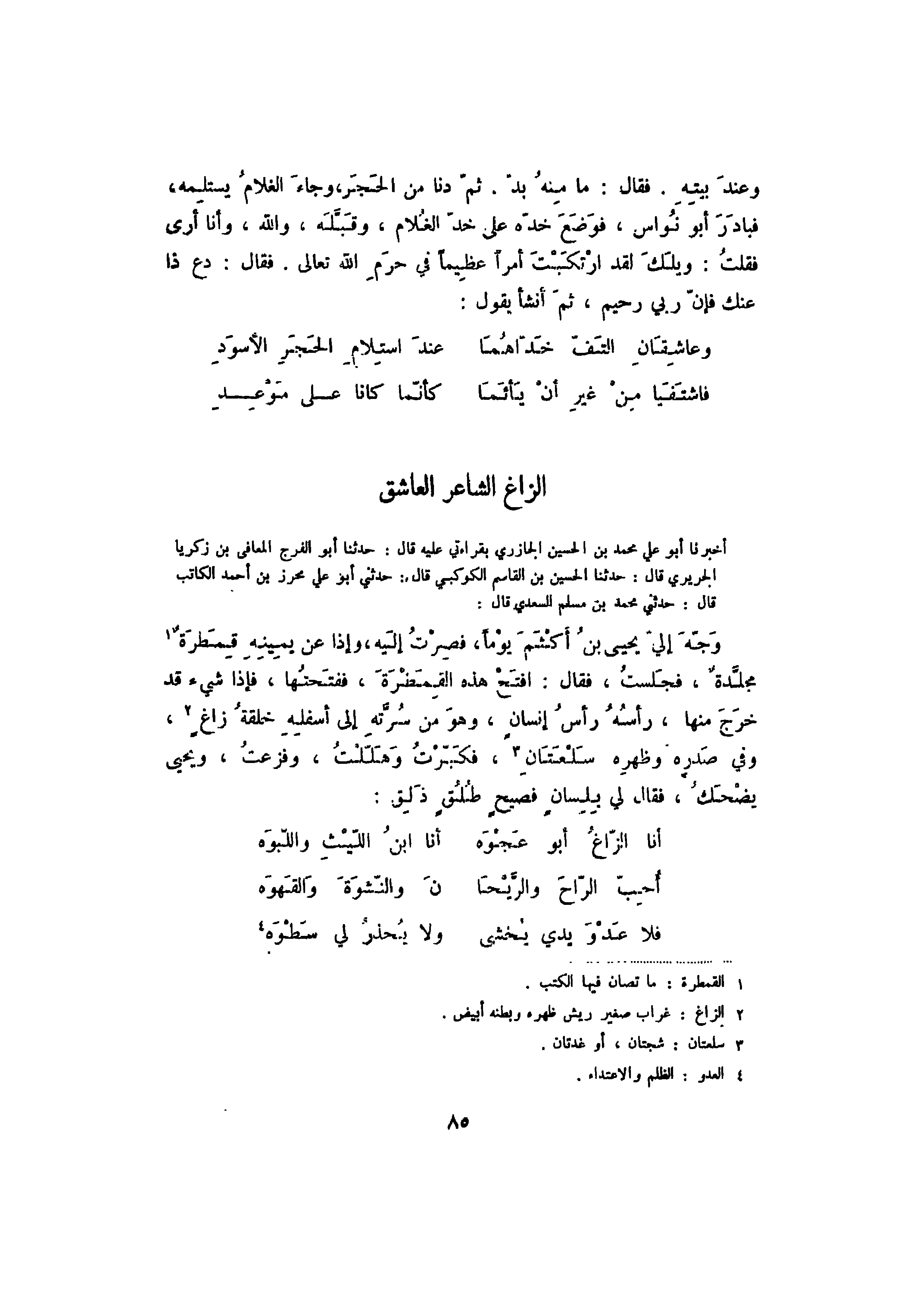 وعند بيته. فقال: ما منه بد. ثم دنا من الحجر، وجاء الغلام يستلمه فبادر أبو نواس، فوضع خده على خد الغلام، وقبله، والله، وأنا أرى فقلت: ويلك لقد ارتكبت أمراً عظيماً في حرم الله تعالى. فقال: دع ذا عنك فإن ربي رحيم، ثم أنشأ يقول: