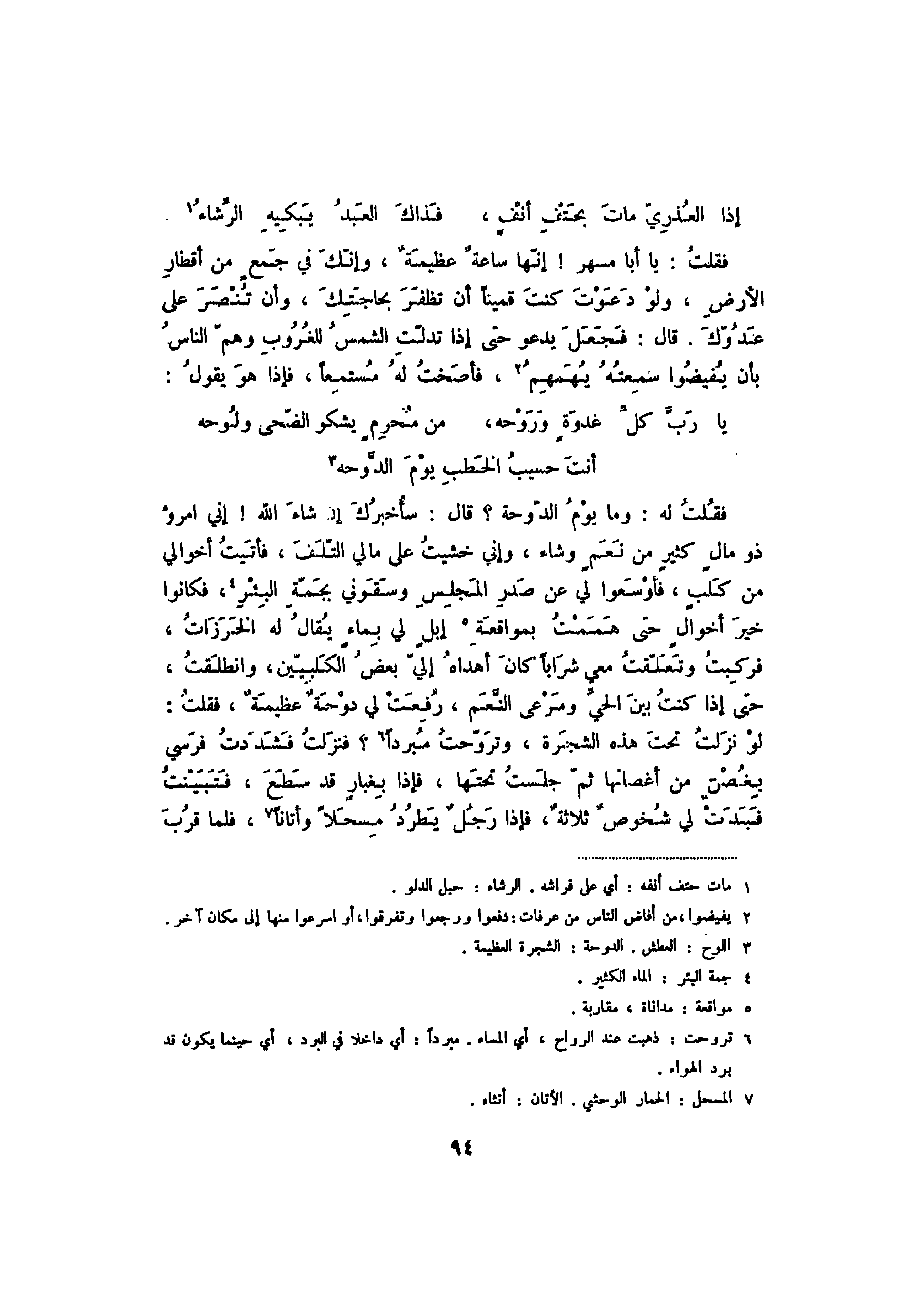فقلت له: وما يوم الدوحة؟ قال: سأخبرك إن شاء الله! إني امرؤ ذو مالٍ كثيرٍ من نعم وشاءن وإني خشيت على مالي التلف، فأتيت أخوالي من كلبٍ، فأوسعوا لي عن صدر المجلس وسقوني بجمة البئر، فكانوا خير أخوال حتى هممت بمواقعة إبل لي بماء يقال له الخرزات، فركبت وتعلقت معي شراباً كان أهداه إلي بعض الكلبيين، وانطلقت، حتى إذا كنت بين الحي ومرعى النعم، ورفعت لي دوحة عظيمة، فقلت: لو نزلت تحت هذه الشجرة، وتروحت مبرداً؟ فنزلت فشددت فرسي بغصنٍ من أغصانها ثم جلست تحتها، فإذا بغبار قد سطع، فتبينت فبدت لي شخوص ثلاثة، فإذا رجل يطرد مسحلاً وأتانا، فلما قرب