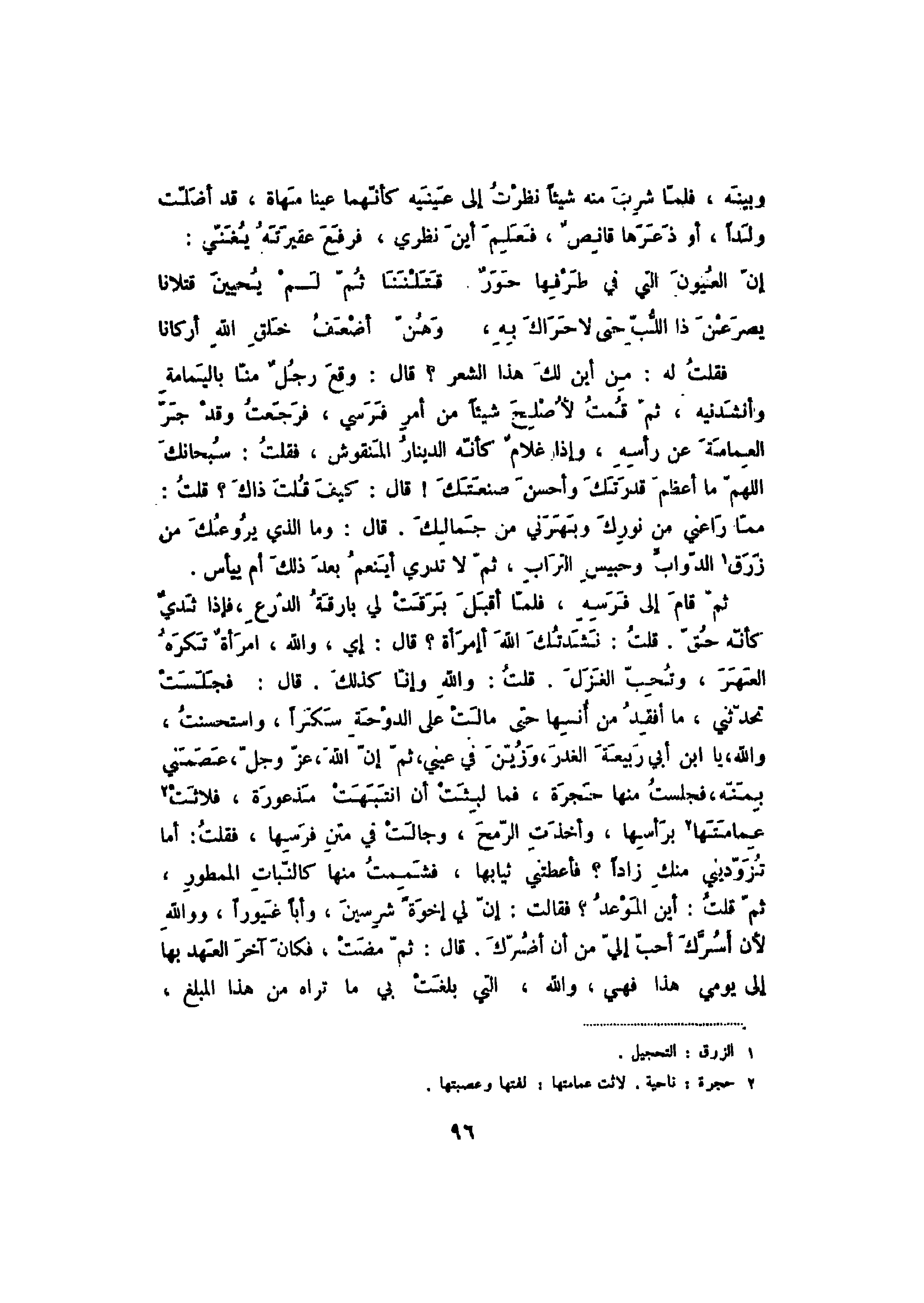 ثم قال إلى فرسه، فلما أقبل برقت لي بارقة الدرع، فإذا ثدي كأنه حق. قلت: نشدتك الله أإمرأة؟ قال: إي، والله، امرأة تكره العهر، وتحب الغزل. قلت: والله وإنا كذلك. قال: فجلست تحدثني، ما أفقد من أنسها حتى مالت على الدوحة سكراً، واستحسنت والله، يا ابن أبي ربيعة الغدر، وزين في عيني، ثم إن الله، عز وجل، عصمني بمنه، فجلست منها حجرة، فما لبثت أن انتبهت مذعورة، فلاثت عمامتها برأسها، وأخذت الرمح، وجالت في متن فرسها، فقلت: أما تزوديني منك زاداً؟ فأعطتني ثيابها، فشممت منها كالنبات الممطور، ثم قلت: أين الموعد؟ فقالت: إن لي أخوة شرسين، وأباً غيوراً، والله لأن أسرك أحب إلي من أن أضرك. قال: ثم مضت، فكان آخر العهد بها إلى يومي هذا فهي، والله، التي بلغت بي ما تراه من هذا المبلغ،