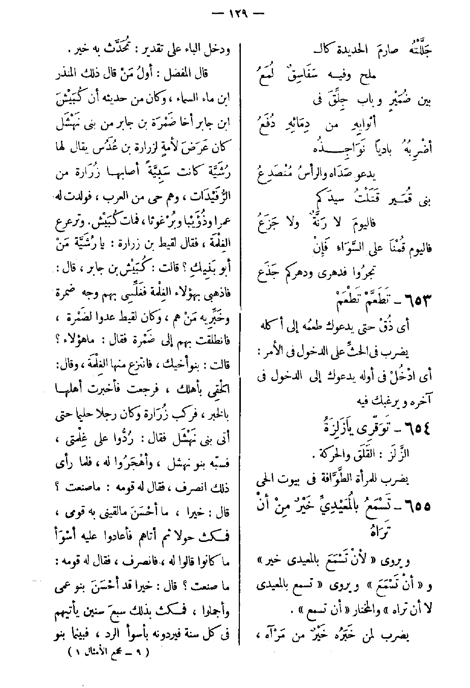 قال المفضل: أولُ مَنْ قال ذلك المنذر ابن ماء السماء، وكان من حديثه أن كُبَيْشَ ابن جابر أخا ضَمْرَة بن جابر من بني نَهْشَل كان عَرَضَ لأمةٍ لزرارة بن عُدُس يقال لها رُشَيَّة كانت سَبِيَّةً أصابها زُرَارة من الرُّفَيْدَات، وهو حي من العرب، فولدت له عمرا وذُؤَيْبا وبُرْغوثا، فمات كُبَيْش. وترعرع الغِلْمَة، فقال لقيط بن زرارة: يا رُشَيَّة مَنْ أبو بَنِيكِ؟ قالت: كُبَيْش بن جابر، قال: فاذهبي بهؤلاء الغِلْمة فغَلِّسِي بهم وجه ضمرة وخَبِّرِيه مَنْ هم، وكان لقيط عدوا لضَمْرة، فانطلقت بهم إلى ضَمْرة فقال: ما هؤلاء؟ قالت: بنو أخيك، فنتزع منها الغِلْمَة، وقال: الْحَقِي بأهلك، فرجعت فأخبرت أهلها بالخبر، فركب زُرَارة وكان رجلا حليما حتى أتى بني نَهْشَل فقال: رُدُّوا على غِلْمتي، فسبّه بنو نهشل، وأهْجَرُوا له، فلها رأى ذلك انصرف، فقال له قومه: ما صنعت؟ قال: خيرا، ما أحْسَنَ مالقيني به قومي، فمكث حولا ثم أتاهم فأعادوا عليه أسْوَأ ما كانوا قالوا له، فانصرف، فقال له قومه: ما صنعت؟ قال: خيرا قد أحْسَنَ بنو عمي وأجملوا، فمكث بذلك سبعَ سنين يأتيهم في كل سنة فيردونه بأسوأ الرد، فبينما بنو -[130]- نهشل يسيرون ضُحًى إذ لحق بهم لاحِقٌ فأخبرهم أن زرارة قد مات، فقال ضمرة: يا بني نهشل، إنه قد مات حليم إخوتكم اليوم فاتقوهم بحقهم، ثم قال ضمرة لنسائه: قِفْنَ أقْسِمْ بينكن الثكل، وكانت عنده هند بنت كرب بن صفوان وامرأةٌ يقال لها خُلَيْدَة من بني عجل وسَبِية من عبد القيس وسَبِية من الأزد من بني طَمَثان، وكان لهنَّ أولاد غيرَ خُليدة، فقالت لهند وكانت لها مُصَافية: ولى الثكلَ بنتَ غيرِك، ويروى وَلِّى الثكل بنت غيرك، على سبيل الدعاء، فأرسَلَتْها مثلا، فأخذ ضمرة شِقَّةَ بن ضمرة وأمه هند وشهابَ بن ضمرة وأمه العبدية وعَنْوَة بن ضمرة وأمه الطمثانية، فأرسل بهم إلى لَقيط بن زُرَارة وقال: هؤلاء رُهُن لك بغِلْمَتك حتى أرضيك منهم، فلما وقع بنو ضمرة في يَدَيْ لقيط أساء ولايتهم وجفاهم وأهانهم، فقال في ذلك ضمرة بن جابر: