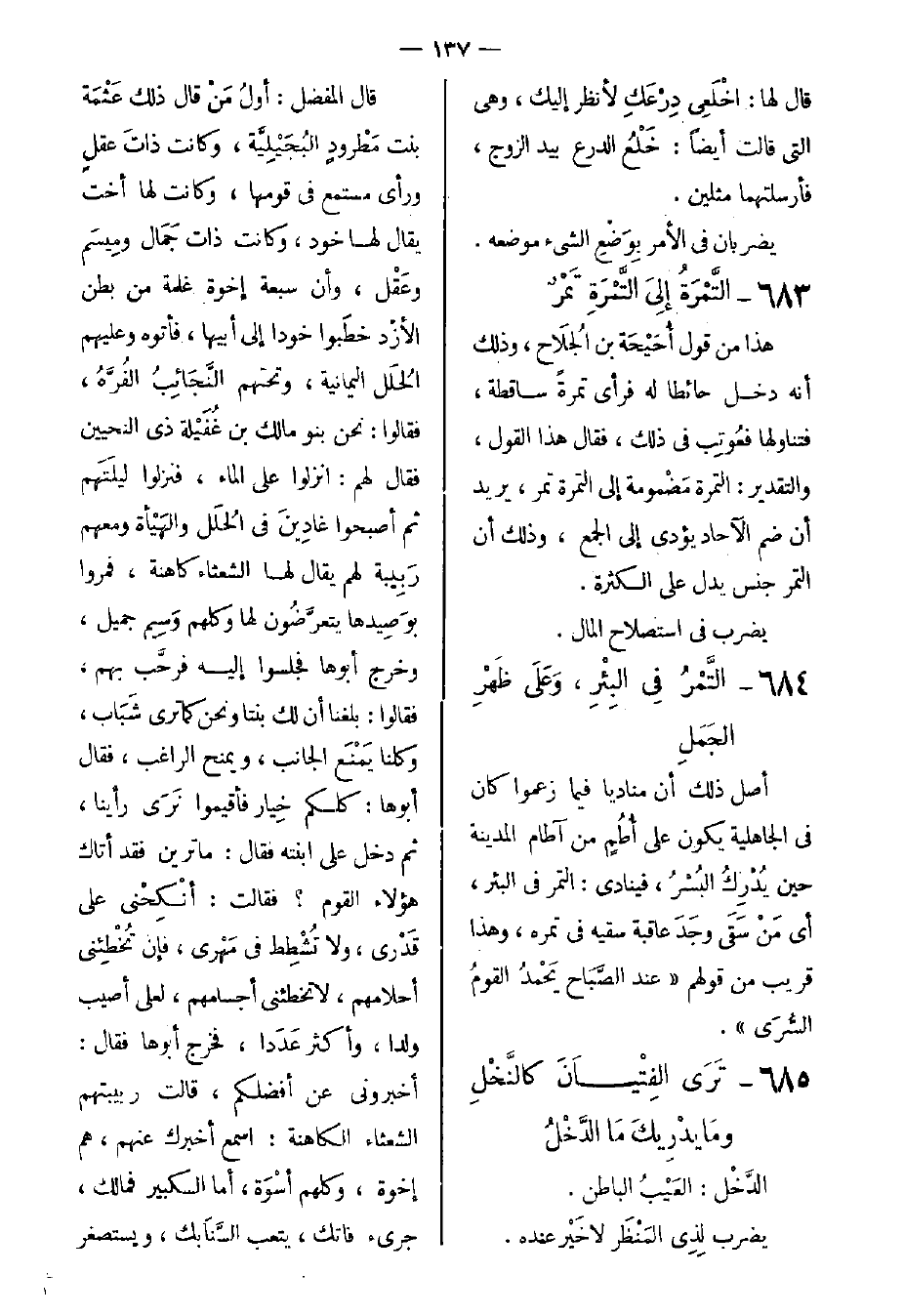 قال المفضل: أولُ من قال ذلك عَثْمَة بنت مَطْرودٍ البُجَيْلِيَّة، وكانت ذاتَ عقلٍ ورأى مستمع في قومها، وكانت لها أخت يقال لها خود، وكانت ذات جَمَال ومِيسَم وعَقْل، وأن سبعة إخوة غلمة من بطن الأزْد خطَبوا خودا إلى أبيها، فأتوه وعليهم الحُلَل اليمانية، وتحتهم النَّجَائِبُ الفُرَّهُ، فقالوا: نحن بنو مالك بن غُفَيْلة ذي النحيين فقال لهم: انزلوا على الماء، فنزلوا ليلَتَهم ثم أصبحوا غادِينَ في الحُلَل والهَيْأة ومعهم رَبِيبة لهم يقال لها الشعثاء كاهنة، فمروا بوَصِيدها يتعرَّضُون لها وكلهم وَسِيم جميل، وخرج أبوها فجلسوا إليه فرحَّب بهم، فقالوا: بلغنا أن لك بنتا ونحن كما ترى شَبَاب، وكلنا يَمْنَع الجانب، وبمنح الراغب، فقال أبوها: كلكم خِيار فأقيموا نَرَى رأينا، ثم دخل على ابنته فقال: ما ترين فقد أتاك هؤلاء القوم؟ فقالت أنْكِحْني على قَدْري، ولا تُشْطِط في مَهْري، فإن تُخْطِئني أحلامهم، لا تخطئني أجسامهم، لعي أصيب ولدا، وأكثر عَدَدا، فخرج أبوها فقال: أخبروني عن أفضلكم، قالت ربيبتهم الشعثاء الكاهنة: اسمع أخبرك عنهم، هم إخوة، وكلهم أسْوَة، أما الكبير فمالك، جريء فاتك، يتعب السَّنَابك، ويستصغر -[138]- المَهَالك، وأما الذي يليه فالغَمْر، بحر غَمْر، يقصر دونه الفَخْر، نَهْد صَقْر، وأما الذي يليه فعَلْقَمَة، صليب المَعْجَمَة، مَنِيع المشتمة، قليل الجمجمة، وأما الذي يليه فعاصم، سَيِّدٌ ناعم، جَلْد صارم، أبيٌّ حازم، جيشُه غانم، وجاره سالم، وأما الذي يليه فثَوَاب، سريع الجَوَاب، عَتيد الصَّوَاب، كريم النِّصَاب، كلَيْث الغاب، وأما الذي يليه فَمُدْرِك، بَذْول لما يَمْلك، عَزُوب عما يترك، يُفْنِى ويُهْلِك، وأما الذي يليه فجَنْدَل، لقِرْنه مُجَدّل، مقل لما يَحْمِل، يُعْطي ويَبْذُل، وعن عدوه لا يَنْكُل، فشاورت أختها فهيم، فقالت أختها عَثْمَةُ: ترى الفِتيان كالنخل وما يدريك ما الدَّخْل، اسمعي مني كلمة، إن شرّض الغريبة يُعْلَن، وخيرها يُدْفَن، انكِحِي في قومك ولا تغررك الأجسام، فلم تقبل منها، وبعثت إلى أبيها أنكِحْنِي مدركا، فأنكحها أبوها على مائة ناقة ورُعَاتها، وحَمَلَها مدرك، فلم تَلْبث عنده إلا قليلا حتى صَبَّحهم فوارسُ من بني مالك بن كنانة، فاقتتلوا ساعة ثم إن زوجها وإخوته وبني عامر انكَشَفُوا فَسَبَوْهَا فيمن سَبَوْا، فبينا هي تسير بكَتْ، فقالوا: ما يبكيك؟ أعلى فراق زوجك؟ قالت: قَبَّحه الله! قالوا: لقد كان جميلا، قالت: قبح الله جمالا لا نَفْع معه، إنما أبكي على عصياني أختي وقولها "ترى الفيان كالنخل وما يدريك ما الدخل" وأخبرتهم كيف خطبوها، فقال لها رجل منهم يكنى أبا نُوَاس شاب أسود أَفْوَهُ مضطرب الخلق: أَتَرْضَيْنَ بي على أن أمنعك من ذئاب العرب، فقالت لأصحابه: أكذلك هو؟ قالوا: نعم إنه مع ما تَرَيْنَ ليَمْنَعُ الحَلِيلة، وتَتَّقِيه القبيلة، قالت: هذا أجمل جمال، وأكمل كمال، قد رضيت به، فزوجوها منه.