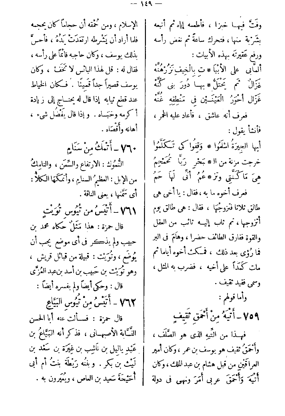 فهذا من التِّيِه الذي هو الصَّلَف، وأَحْمَقُ ثقيف هو يوسف بن عمر، وكان أمير العراقَيْنِ من قبل هشام بن عبد الملك، وكان أَتْيَهَ وأَحْمَقَ عربي أَمَرَ ونهى في دولة الإسلام، ومن حُمْقه أن حجاماً كان يحجمه فلما أراد أن يَشْرطه ارتعَدَتْ يَدُهُ، فأحسَّ بذلك يوسف، وكان حاجبه قائماً على رأسه، فقال له: قل لهذا البائس لا تَخَفْ، وكان يوسف قصيراً جداً قَمِيئاً. فكان الخياط عند قطع ثيابه إذا قال له يحتاج إلى زيادة أكرمه وحَبَاه. وإذا قال يَفْضُل شيء، أهانه وأَقْصَاه.
