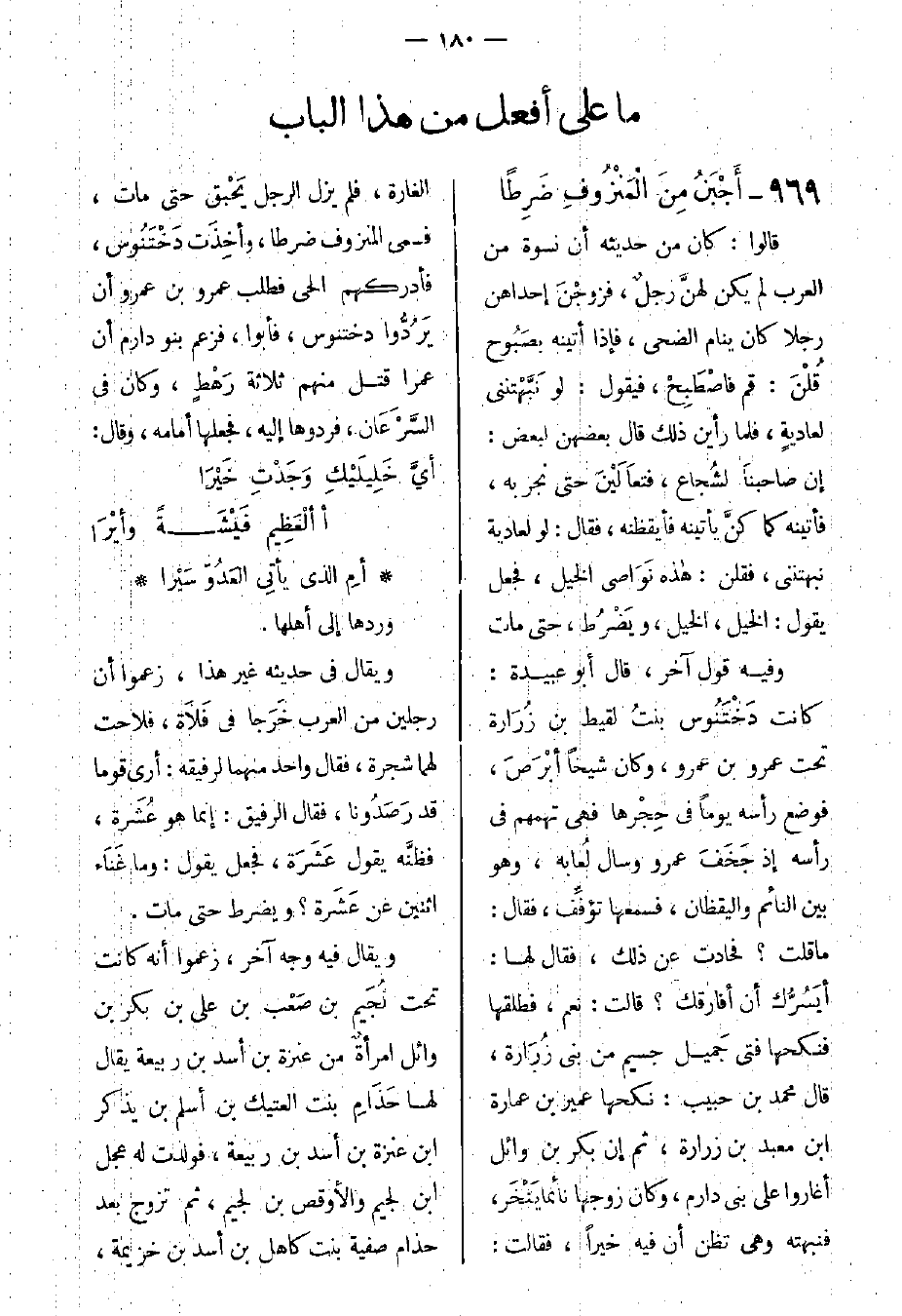 ويقال في حديثه غير هذا، زعموا أن رجلين من العرب خَرَجا في فَلاَة، فلاحت لهما شجرة، فقال واحد منهما لرفيقه: أرى قوما قد رَصَدُونا، فقال الرفيق: إنما هو عُشَرة، فظنَّه يقول عَشَرَة، فجعل يقول: وما غَنَاء اثنين عن عَشَرة؟ ويضرط حتى مات.