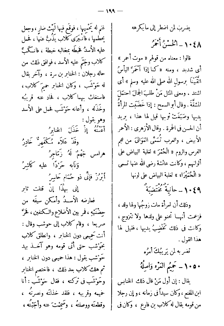 فعارضه الأسدُ وأمكن سيفَه من حِضْنَيْهِ، فمر بين الأضلاع والكتفين، فخرَّ صريعا، وقام كلاب إلى حوشب وقال: أنت حَمِيمي دون الخنابر، وانطلق كلاب بحَوْشب حتى أتى قومه وهو آخذ بيد حَوْشب يقول: هذا حميمي دون الخنابر، ثم هلك كلاب بعد ذلك، فاختصم الخنابر وحَوْشَب في تركته، فقال حَوْشَب: أنا حميمه وقريبه، فلقد خذلتَه ونصرتُه، وقطعتَه ووصلتهُ، وصَمِمْتُ عنه وأجَبْتُه، -[200]- واحتكَما إلى الخنابس فقال: وما كان من نُصْرَتك إياه؟ فقال: