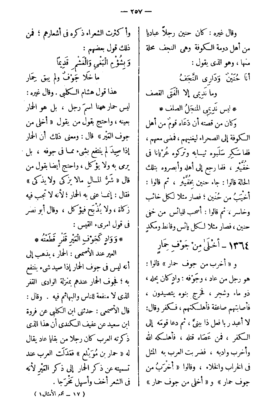 و"أخرب من جوف حمار" قالوا: هو رجل من عاد، وجَوْفه: وادٍ كان يحله، ذو ماء وشجر، فخرج بنوه يتصيدون، فأصابتهم صاعقة فأهلكتهم، فكفر وقال: لا أعبد ربا فعل ذا ببنيَّ، ثم دعا قومَه إلى الكفر، فمن عَصَاه قتله، فأهلكه الله وأخرب واديه، فضربت العرب به المثل في الخراب والخلاء، وقالوا "أخْرَبُ من جوف الحمار" و "أخلى من جوف حمار" وأكثرت الشعراء ذكره في أشعارهم، فمن ذلك قول بعضهم: