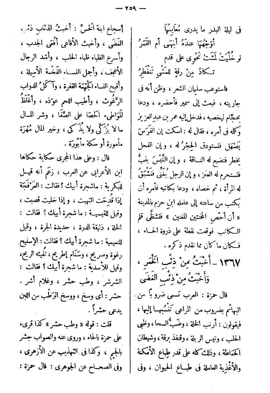 قال حمزة: العرب تسمي ضروباً من البهائم بضروب من المراعي تَنْسُبها إليها، فيقولون: أرنب الخلة، وضَبُّ السحا، وظبي الحلب، وتيس الربلة، وقنفذ برقة، وشيطان الحَمَاطة، وذلك كله على قدر طِباع الأمكنة والأغْذِية العاملة في طباع الحيوان، وفي أسجاع ابنة الخُسِّ: أخبثُ الذئابِ ذئب الغَضَى، وأخبث الأفاعي أفْعَى الجدب، وأسرع الظباء ظباء الحلب، وأشد الرجال الأعجف، وأجمل النساء الفَخْمة الأسيلة، وأقبح النساء الْجَهْمَة القفرة، وآكَلُ الدواب الرَّغُوث، وأطيب اللحم عوّذه، وأغْلَظُ المَوَاطئ الحَصَا على الصَّفَا، وشر المال ما لا يُزَكَّى ولا يُذَكى، وخير المال مُهْرَة مأمورة أو سكة مأبُورَة.