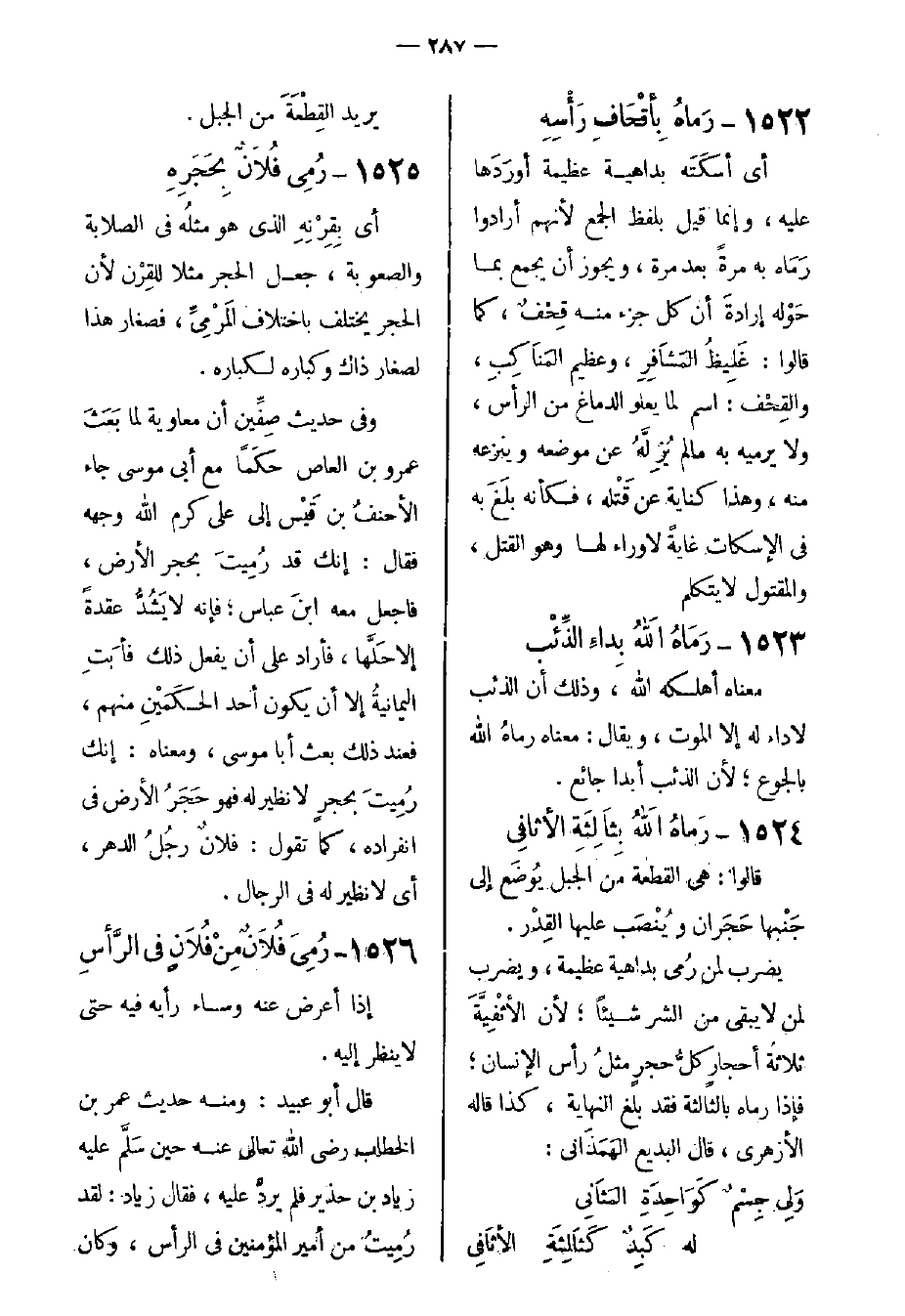1522- رَماهُ بِأقْحَافِ رَأْسِهِ.