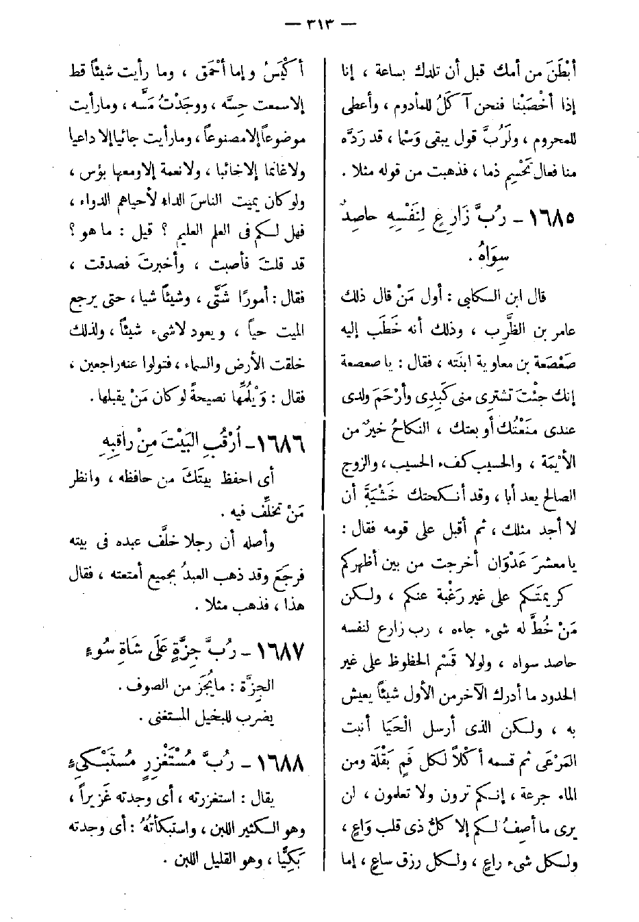 قال ابن الكلبي: أول مَنْ قال ذلك عامر بن الظَّرِب، وذلك أنه خَطَب إليه صَعْصَعة بن معاوية ابنَته، فقال: يا صعصعة إنك جئْتَ تشترِي مني كَبِدِي وأرْحَمَ ولدي عندي منَعْتُك أو بعتك، النكاحُ خيرٌ من الأيْمَة، والحسيب كفء الحسيب، والزوج الصالح يعد أبا، وقد أنكحتك خَشْيَةَ أن لا أجد مثلك، ثم أقبل على قومه فقال: يا معشرَ عَدْوَان أخرجت من بين أظهركم كريمَتكم على غير رَغْبة عنكم، ولكن مَنْ خُطَّ له شيء جاءه، رب زارع لنفسه حاصد سواه، ولولا قَسْم الحظوظ على غير الحدود ما أدرك الآخر من الأول شيئاً يعيش به، ولكن الذي أرسل الْحَيَا أنبت المَرْعَى ثم قسمه أكْلاً لكل فَمٍ بَقْلَة ومن الماء جرعة، إنكم ترون ولا تعلمون، لن يرى ما أصِفُ لكم إلا كلُّ ذي قلب وَاعٍ، ولكل شيء راعٍ، ولكل رزق ساعٍ، إما أكْيَسُ وإما أحْمَق، وما رأيت شيئاً قط إلا سمعت حِسَّه، ووجَدْتُ مَسَّه، وما رأيت موضوعاً إلا مصنوعاً، وما رأيت جائيا إلا داعيا ولا غانما إلا خائبا، ولا نعمة إلا ومعها بؤس، ولو كان يميت الناسَ الداءُ لأحياهم الدواء، فهل لكم في العلم العليم؟ قيل: ما هو؟ قد قلتَ فأصبت، وأخبرتَ فصدقت، فقال: أموراً شَتَّى، وشيئاً شيا، حتى يرجعع الميت حياً، ويعود لاشيء شيئاً، ولذلك خلقت الأرض والسماء، فتولوا عنه راجعين، فقال: وَيْلُمِّها نصيحةً لو كان مَنْ يقبلها.