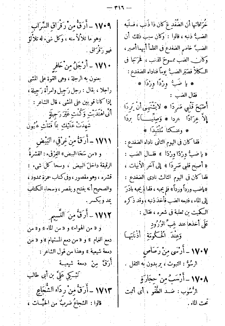 قالوا: الشجاعُ ضربٌ من الحيَّات، -[317]- ورداؤه: قِشرْهُ، ويقال أيضاَ "أرق من ريق النحل" وهو لُعابه و "مِن دين القَرَامِطَة".
