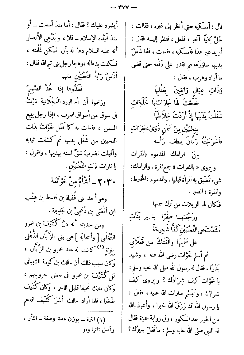 ومن حديثه أنه دلَّ كُثَيْفَ بن عمرو التَّغْلَبي [وأصحابَه] على بني الزَّبَّان الذُّهْلي لِتِرَةٍ (الترة - بوزن عدة وصفة - الثأر، وأصل تائها واو) كانت له عند عمرو بن الزَّبَّان، وكان سبب ذلك أن مالك بن كومة الشيباني لقي كُثَيِّفَ بن عمرو في بعض حروبهم، وكان مالك نحيفا قليل اللحم، وكان كُثَيف ضَخْما، فلما أراد مالك أسْرَ كُثَيف اقتحم -[378]- كثيف عن فرسه لينزل إليه مالك، فأوْجَرَه مالك السِّنَانَ، وقال: لتسأسِرَنَّ أو لأقتلنك، فاحْتَقَّ فيه هو وعمرو بن الزَّبَّان، وكلاهما أدركه، فقالا: قد حكمنا كُثَيفا، يا كثيف مَنْ أسَرَك؟ فقال: لولا مالك بن كومة كنت في أهلي، فلطَمه عمرو بن الزَّبَّان، فغضب مالك، وقال: تَلْطم أسيري؟ إن فداءك يا كثيف مائة بعير، وقد جعلتُهَا لك بلَطْمة عمرو وَجْهَك، وجَزَّ ناصيته وأطلقه، فلم يزل كُثَيف يطلب عمرا باللَّطْمة حتى دلَّ عليه رجل من غُفَيلة يقال له خَوْتَعة، وقد بَدَّتْ لهم إبل، فخرج عمرو وإخوته في طَلَبها فأدركوها فذبَحُوا حُوَارا فاشْتَوَوْهُ وجلسوا يَتَغَدَّون، فأتاهم كُثَيف بضِعْف عددهم، وأمرهم إذا جلسوا معهم على الغدَاء أن يكتنف كلَّ رجلٍ منهم رجلان، فمروا بهم مجتازين، فدُعُوا فأجابهم، فجلسوا كما ائتمروا فلما حَسَر كُثَيف عن وجهه العمامةَ عرفه عمرو، فقال: ياكثيف إن في خَدِّي وَفَاء من خدك، وما في بكر بن وائل خد أكْرَمُ منه، فلا تشبَّ الحربَ بيننا وبينك، فقال: كلا بل أقتلك وأقتل إخْوَتَكَ، قال: فإن كنت فاعلا فأطلق هؤلاء الفتية الذين لم يتلبسوا بالحروب، فإن وراءهم طالباً أطْلَبَ مني، يعني أباهم، فقتلهم وجعل رؤوسهم في مِخْلاَة وعلَّقها في عنق ناقة لهم يقال لها الدُّهَيْم، فجاءت الناقة والزبَّان جالسٌ أمام بيته حتى بركت، فقال: يا جارية هذه ناقة عمرو، وقد أبطأ هو وإخوتُه، فقامت الجارية فجَسَّت المخلاة، فقالت: قد أصاب بَنُوكَ بَيْضَ نعام، فجاءت بها إليه، وأدخلت يدها فأخرجت رأس عمرو أولَ ما أخرجت، ثم رؤوسَ إخوته، فَغَسلها ووضَعها على تُرْسٍ وقال: آخِرُ البَزِّ على القَلُوص، وقال أبو الندى: معناه هذا آخر عهدي بهم، لا أراهم بعده، فأرسلها مثلا، وضرب الناس بحمل الدُّهَيْم المثلَ، فقالوا: أثْقَلُ من حمل الدهيم، فلما أصبح نادى: يا صَبَاحاه، فأتاه قومه، فقال: والله لأحَوِّلَنَّ بيتي ثم لا أردُّه إلى حاله الأول حتى أدرك ثاري، وأطفى ناري فمكث بذلك حيناً لا يدري مَنْ أصاب ولده ومَنْ دَلَّ عليهم، حتى خُبِّر بذلك، فحلف لا يحرِّمُ دم غُفَلِىٍّ حتى يدلُّوه كما دلُّوا عليه، فجعل يغزو بني غُفَيلة حتى أثْخَن فيهم، فبينما هو جالس عند ناره إذ سمع رُغَاء بعير، فإذا رجل قد نزل عنه حتى أتاه فقال: من أنت؟ فقال: رجل من بني غُفَيلة، فقال: أنت وقد آن لك، فأرسلها مثلا، فقال: هذه خمسة وأربعون بيتاً من بني تَغْلب بالإقطانتين، يعني موضعا بناحية الرقة، فسار إليهم الزَّبَّان -[379]- ومعه مالك بن كومة، قال مالك: فَنَعِسْتُ على فرسي وكان ذريعا فتقدم بي، فما شَعَرْتُ إلا وقد كرع في مقراة القوم، فجذبته فمشى على عقبيه فسمعت جارية تقول: ياأبت هل تمشي الخيل على أعقابها؟ فقال لها أبوها: وما ذاك يا بنية؟ قالت: رأيت الساعة فرسا كَرَعَ في المقراة ثم رجع على عقبيه، فقال لها: ارْقُدِي فإني أبغض الجاريةَ الكَلُوء العينِ، فلما أصبحوا أتتهم الخيل دَوَاسَّ، أي يتبع بعضُها بعضا فقتلوهم جميعا.