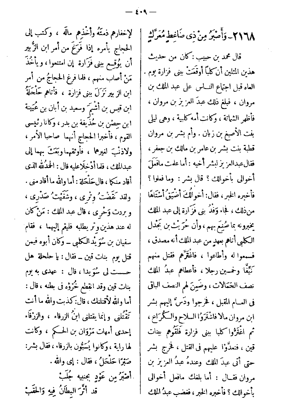 قال محمد بن حبيب: كان من حديث هذين المثلين أن كلباً أوقَعَتْ ببني فزارة يوم. العاه قبل اجتماع الناس على عبد الملك بن مروان، فبلغ ذلك عبدَ العزيز بن مروان، فأظهر الشماتة، وكانت أمه كليبة، وهي ليلى بنت الأصبع بن زبان. وأم بشر بن مروان قطبة بنت بشر بن عامر بن مالك بن جعفر، فقال عبد العزيز لبشر أخيه: أما علمت ما فَعَلَ أخوالي بأخوالك؟ قال بشر: وما فعلوا؟ فأخبره الخبر، فقال: أخوالُكَ أضْيَقُ أسْتَاهاً من ذلك، فجاء وَفْدُ بني فَزَارة إلى عبد الملك يخبرونه بما صُنِعَ بهم، وأن حُرَيْث بن بَجْدل الكلبي أتاهم بعهدٍ من عبد الملك أنه مصدق، فسمعوا له وأطاعوا، فاغْتَرَّهم فقتل منهم نَيِّفَّا وخمسين رجلا، فأعطاهم عبدُ الملك نصف الحَمَالات، وضَمِنَ لهم النصف الباقي في العام المقبل، فخرجوا ودَسَّ إليهم بشر ابن مروان مالا فاشْتَرَوُا السلاح والكُرَاع، ثم اغْتَرُّوا كلبا ببني فزارة فَلَقُوهم ببنات قين، فتعدَّوْا عليهم في القتل، فخرج بشر حتى أتى عبدَ الملك وعندهُ عبدُ العزيز بن مروان فقال: أما بلغك ما فعل أخوالي بأخوالك؟ فأخبره الخبر، فغضب عبدُ الملك لإخفارهم ذمتَهُ وأخْذِهم مالَه، وكتب إلى الحجاج يأمره إذا فَرَغَ من أمر ابن الزُّبير أن يُوقِع ببني فَزَارة إن امتنعوا، ويأخُذَ مَنْ أصاب منهم، فلما فرغ الحجاجُ من أمر ابن الزبير نَزَلَ ببنب فزارة، فأتاهم حَلْحَلَةُ ابن قيس بن أشْيَمَ وسعيد بن أبان بن عُيَينة ابن حِصْن بن حُذَيفة بن بدر، وكانا رئيسي القوم، فأخبرا الحجاج أنهما صاحبا الأمر، ولا ذنْبَ لغيرهما، فأوثقهما وبَعَثَ بهما إلى عبد الملك، فلما أدْخِلاَ عليه قال: الحمدُ لله الذي أقاد منكما، قال حلحلة: أما والله ما أقادمني، ولقد نَقَضْتُ وِتْرَي، وشَفَيْتُ صَدْرِي، وبردت وَحْرِي، قال عبد الملك: مَنْ كان له عند هذين وِتر يطلبه فليقم إليهما، فقام سفيان بن سُوَيْد الكلبي - وكان أبوه فيمنقتل يوم بنات قين - فقال: يا حلحلة هل حست لي سُوَيدا، قال: عهدي به يوم بنات قن وقد انقطع خُرْؤه في بطنه، قال: أما والله لأقتلنك، قال: كذبت والله ما أنت تَقْتُلني وإنما يقتلني ابنُ الزرقاء، والزرْقَاء إحدى أمهات مَرْوَان بن الحكم، وكانت لها راية، وكانوا يُسَبُّون بالزرقاء، فقال بشر: صَبْراً حَلْحَلُ، فقال: إي والله.