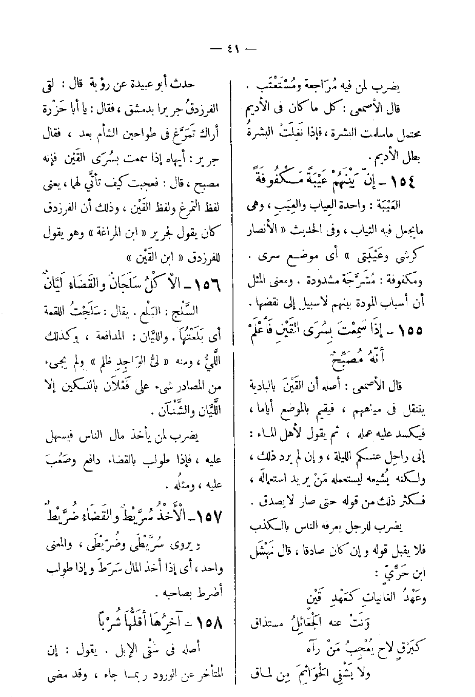 حدث أبو عبيدة عن رؤبة قال: لقي الفرزدقُ جريرا بدمشق، فقال: يا أبا حَزْرة أراك تَمَرَّغ في طواحين الشأم بعد، فقال جرير: أيهاه إذا سمعت بسُرَي القين فإنه مصبح، قال: فعجبت كيف تأتَّي لهما، يعني لفظ التمرغ ولفظ القَيْن، وذلك أن الفرزدق كان يقول لجرير "ابن المراغة" وهو يقول للفرزدق "ابن القَيْن".