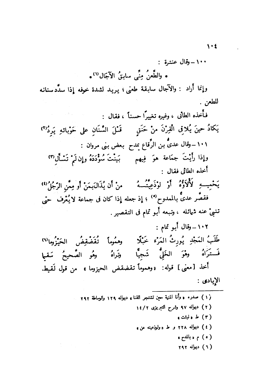 فقصر عديٌ بالممدوح؛ إذ جعله إذا كان في جماعة لم يعرف حتى تنبئ عنه شمائله، وتبعه أبو تمام في التقصير.