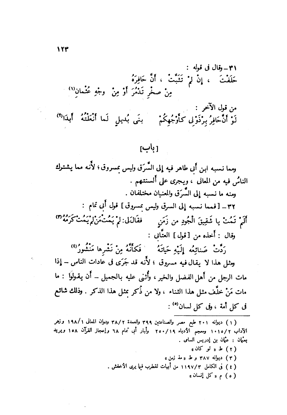 ومما نسبه فيه ابن أبي طاهر إلى السرق ما ليس بمسروق؛ لأنه مما يشترك فيه الناس من المعاني والجاري على ألسنتهم، ومنه ما نسبه إلى السرق والمعنيان مختلفان.