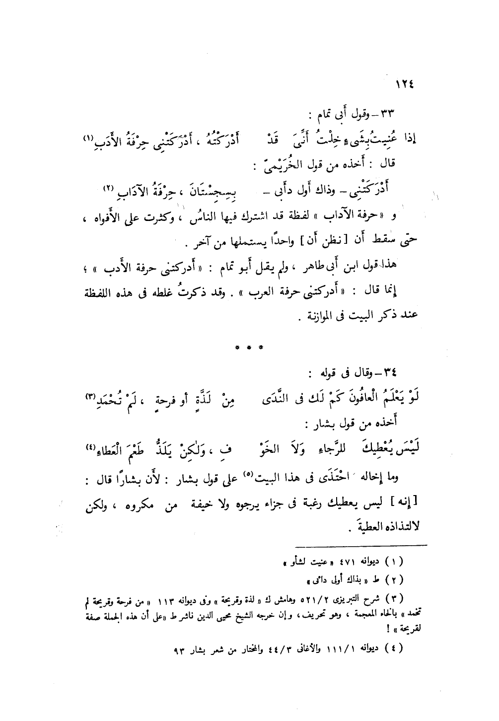ولم يقل أبو تمام ((أدركتنى حرفة الأدب)) إنما قال ((أدركتنى حرفة العرب)) وقد ذكرت غلطه فى هذه اللفظة عند ذكر البيت فى الموازنة.