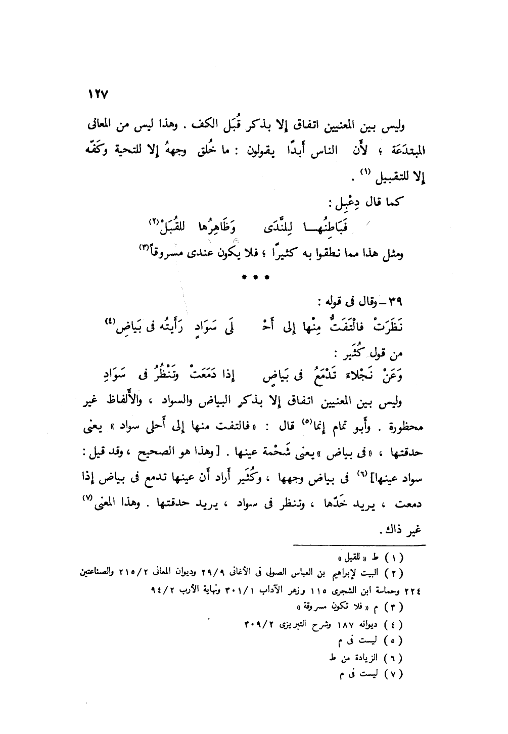 وليس بين المعنيين اتفاق إلا بذكر البياض والسواد، والألفاظ غير محظورة، وأبو تمام إنما قال " فالتفت منها إلى أحلى سواد " يعني حدقتها " في بياض " يعنى شحمة عينها، وهذا هو الصحيح، وقد قيل: سواد عينها في بياض وجهها، وكثير أراد أن عينها تدمع إذا دمعت، يريد خدها، وتنظر في سواد، يعني حدقتها، وهذا المعنى غير ذاك.