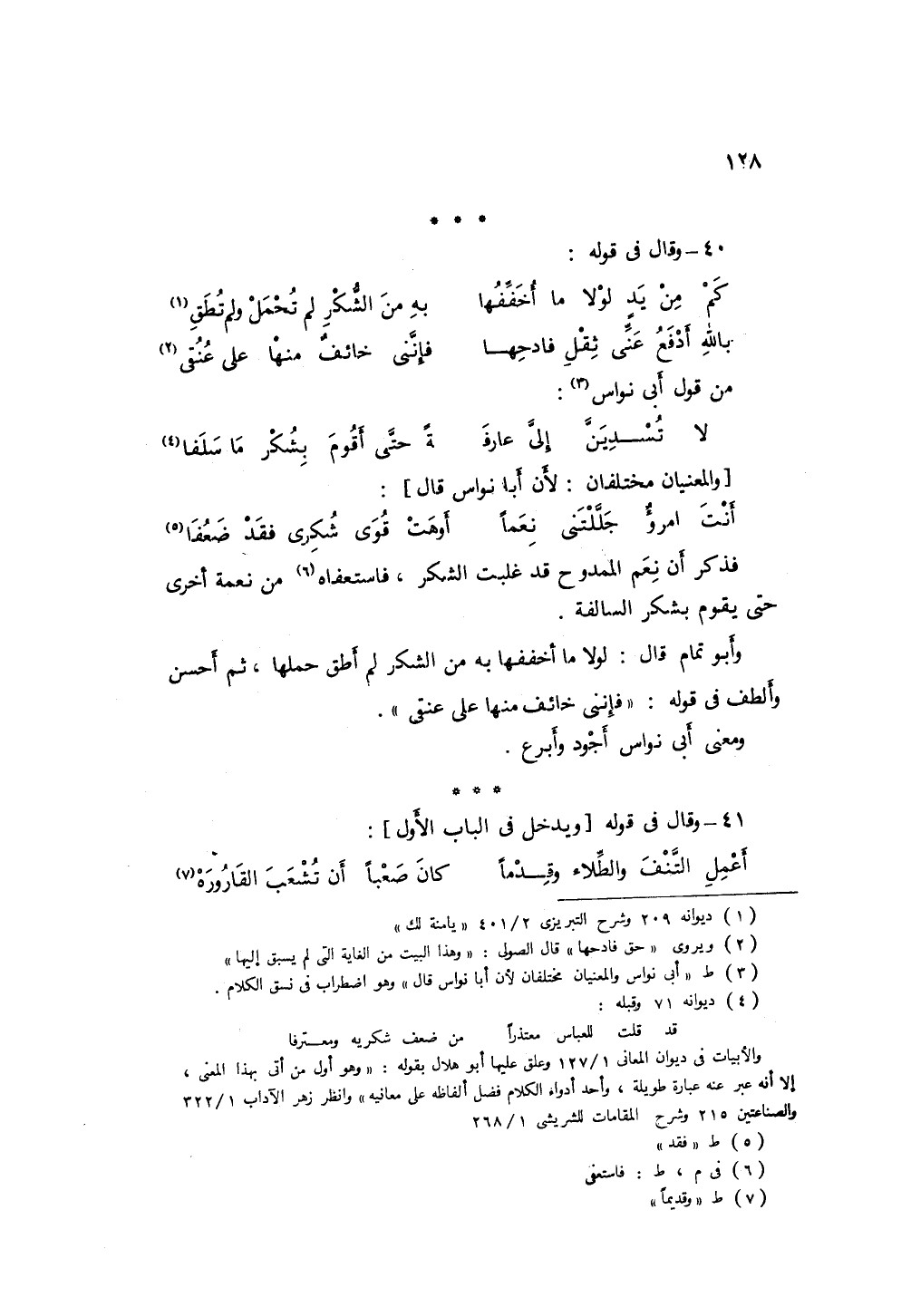فذكر أن نعم الممدوح قد غلبت الشكر، فاستعفاه من نعمة أخرى حتى يقوم بشكر نعمته السالفة، وأبو تمام قال: لولا ما أخففها به من الشكر لم أطق حملها، ثم أحسن وألطف في قوله " فإنني خائف منها على عنقي " ومعنى أب ينواس أجود وأبرع.