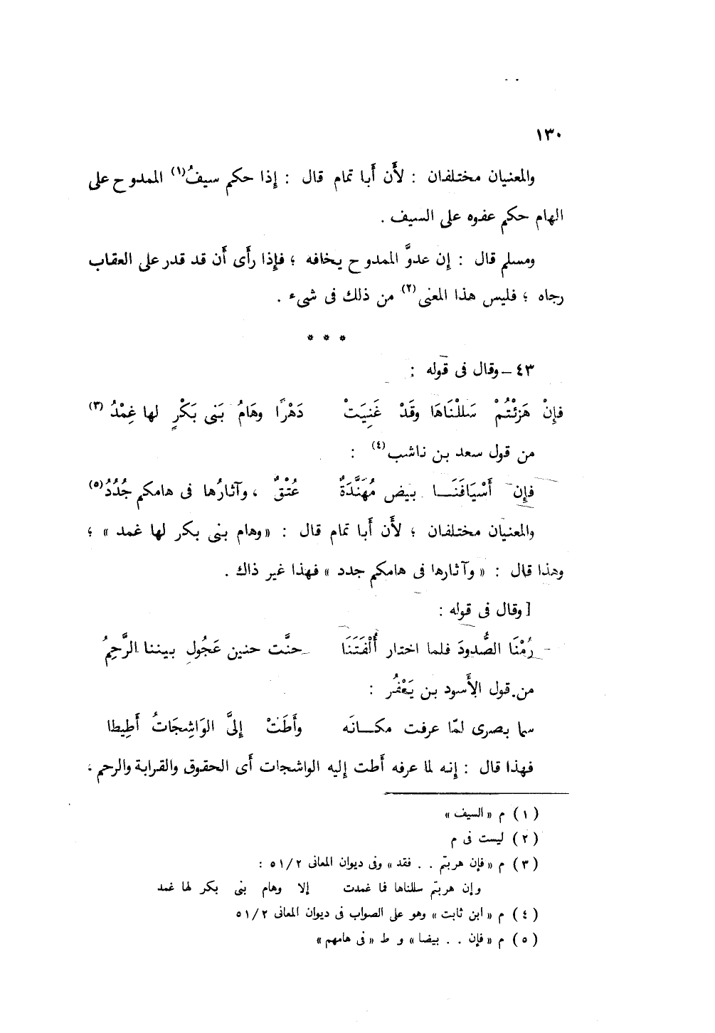 والمعنيان مختلفان؛ لأن أبا تمام قال: إذا حكم سيف الممدوح على الهام حكم عفوه على السيف، ومسلم قال: إن عدو الممدوح يخافه؛ فإذا رأى أن قد قدر على العقاب رجاه؛ فليس هذا المعنى من ذلك في ئيء.