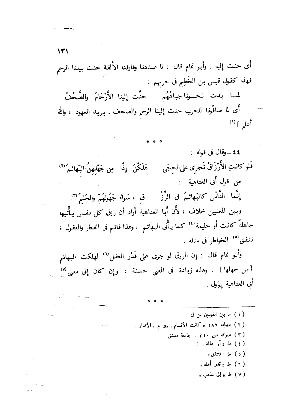 وبين المعنيين خلاف؛ فإن أبا العتاهية أراد أن رزق كل نفس يأتيها - جاهلةً كانت أو عالمةً - كما يأتي البهائم، وهذا قائم في الفطرة والعقول؛ فتتفق الحخواطر في مثله. وأبو تمام قال: إن الرزق لو جرى على قدر العقل لهلكت البهائم، وهذه زيادة في المعنى حسنة، وإن كان إلى مذهب أبي العتاهية يؤول.