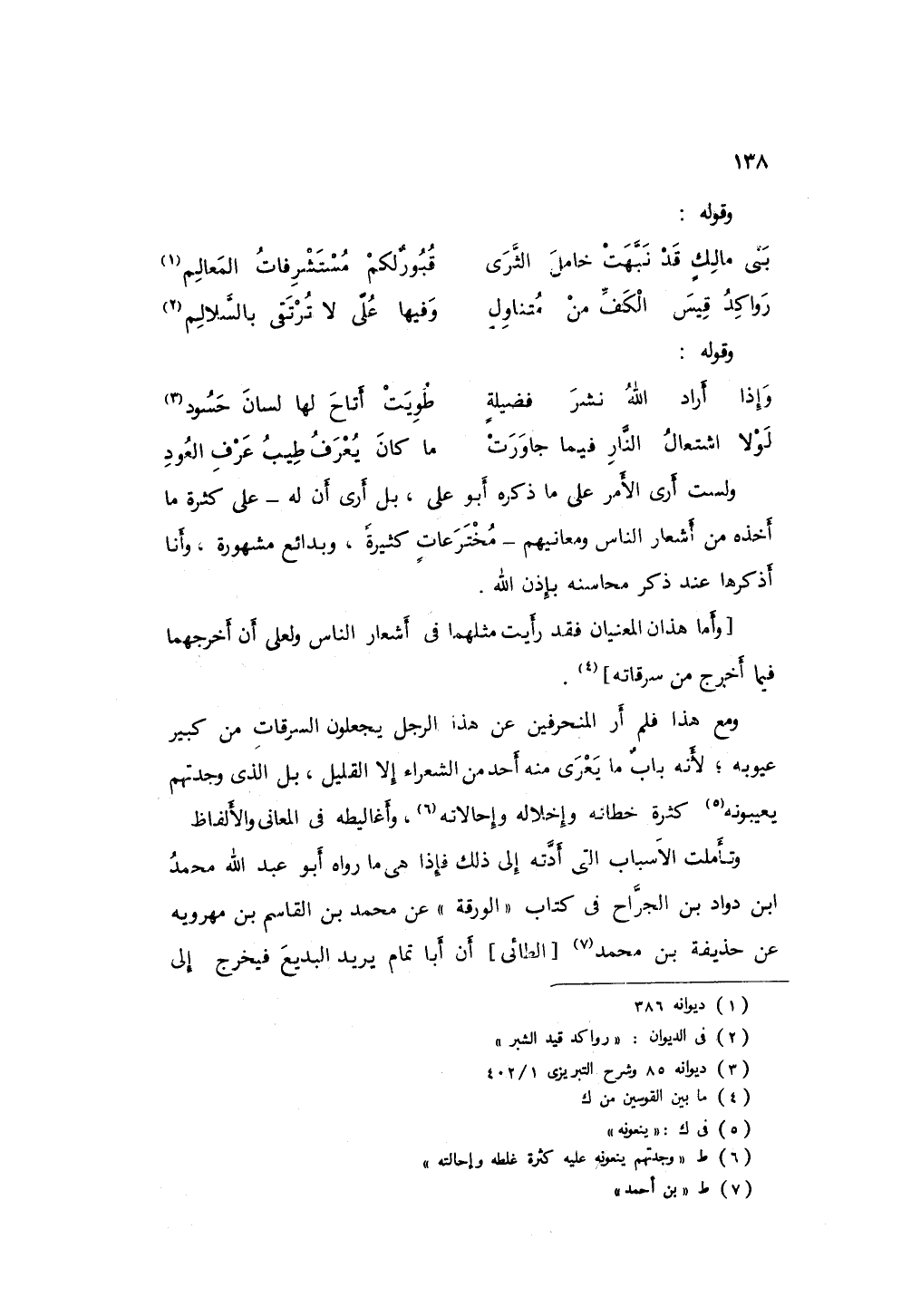 ومع هذا فلم أر المنحرفين عن هذا الرجل يجعلون السرقات من كبير عيوبه؛ لأنه باب ما يعرى منه أحدٌ من الشعراء إلا القليلب، بل الذي وجدتهم ينعونه عليه كثرة غلطة، وإحالته، وأغاليطه في المعاني والألفاظ.
