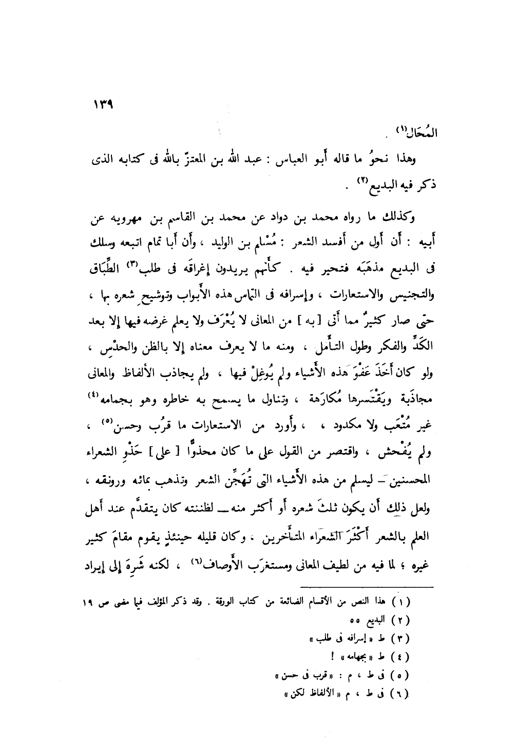 المحال، وهذا نحو ما قاله أبو العباس عبد الله بن المعتز بالله في كتابه الذي ذكر فيه البديع، وكذلك ما رواه محمد بن داود عن محمد بن القاسم بن مهرويه عن أبيه أن أول من أفسد الشعر مسلم بن الوليد، وأن أبا تمام تبعه فسلك في البديع مذهبه فتحير فيه، كأنهم يريدون إسرافه في طلب الطباق والتجنيس والاستعارات، وإسرافه في التماس هذه الأبواب وتوشيح شعره بها، حتى صار كثيرٌ مما أتى به من المعاني لا يعرف ولا يعلم غرضه فيها إلا مع الكد والفكر وطول التأمل، ومنه ما لا يعرف معناه إلا بالظن والحدس، ولو كان أخذ عفو هذه الأشياء ولم يوغل فيها، ولم يجاذب الألفاظ والمعاني مجاذبة ويقتسرها مكارهة، وتناول ما يسمح به خاطره وهو بجمامه غير متعب ولا مكدود، وأورد من الاستعارات ما قرب في حسن، ولم يفحش، واقتصر من القول على ما كان محذوا الشعراء المحسنين؛ ليسلم من هذه الأشياء التي تهجن الشعر وتذهب ماءه ورونقه، ولعل ذلك أن يكون ثلث شعره أو أكثر منه - لظننته كان يتقدم عند أهل العلم بالشعر أكثر الشعراء المتأخرين، وكان قليله حينئذٍ يقوم مقام كثير غيره؛ لما فيه من لطيف المعاني ومستغرب الألفاظ، ولكنه شره إلى إيراد
