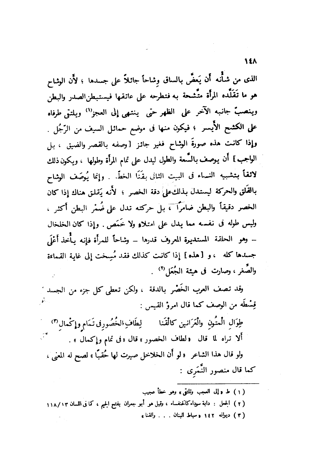 الذي من شأنه أن يعض بالساق - وشحاً حائلا على جسدها ح لأن الوشاح هو ما تقلده المرأة متشحة به، فتطرحه على عاتقها، فيستبطن الصدر والبطن، وينصب جانبه الآخر على الظهر حتى ينتهي إلى الحجز، ويلتقى طرفاه على الكشح الأيسر؛ فيكون مها في موضع حمائل السيف من الرجال، وإذا كانت هذه صورة الوشاح فغير جائز يوسف بالسعة والطول، ليدل على تمام المرأة وطولها، وكون ذلك لائقاً بتشبيه النساء في البيت الثاني بقنا الخط، وإنما يوصف الوشاح بالقلق والحركة ليستدل بذلك على دقة الخصر؛ لأنه يقلق هناك إذا كان الخصر دقيقاً، والبط اضمر، بل حركته تدل على ضمر البطن أكثر، وليس طوله في نفسه مما يدل على امتلاء ولا خمص، وإذا كان الخلخال - وهو الحلقة المستديرة المعروف قدرها - وشاحاً للمرأة فإن يأخذ أعلى جسده كله، وإذا كانت كذلك فقد مسخت إلى غاية القماءة والصغر، وصارت في هيئة الجعل؛ وقد تصف العرب الخصر بالدقة، ولكن تعطى كل جزء من الجسد قسطه من الوصف، كما قال امرؤ القيس:
