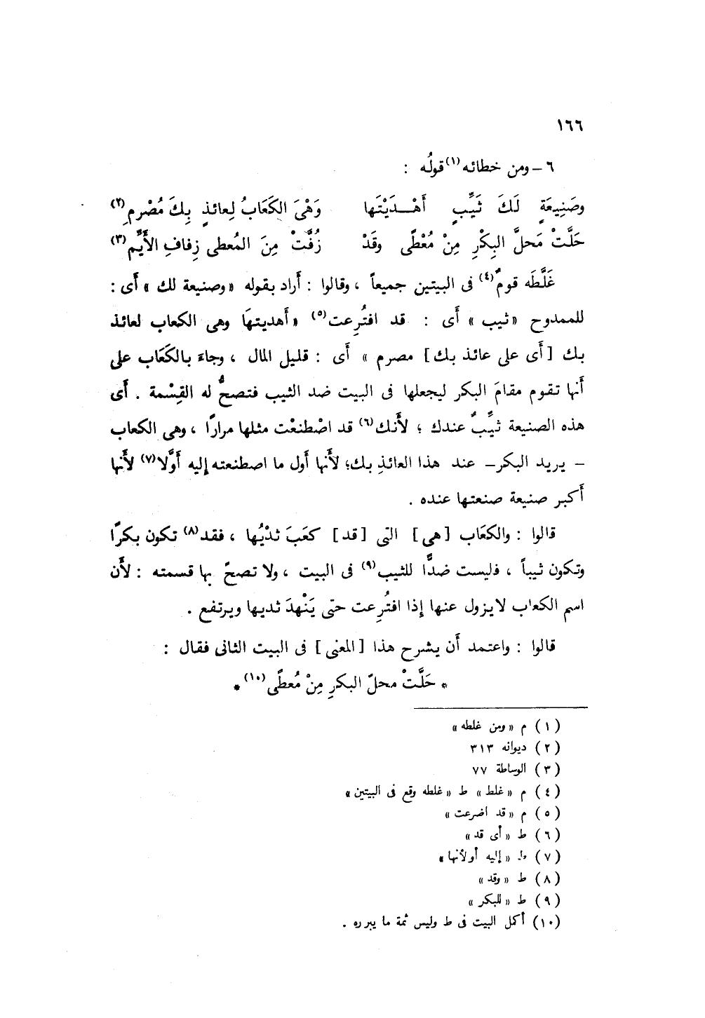 غلطه وقع في البتين جميعاًن وقالوا: أراد بقوله " وصنيعة لك " أي: للممدوح " ثيب " أي: قد افترعت " أهديتها وهي الكعاب لعائذ بك مصرم " أي: قليل المال، وجاء بالكعاب على أنها تقوم مقام البكر ليجعلها في البيت ضد الثيب فتصبح له القسمة: أي هذه الصنيعة ثيبٌ عندك: أي قد اصطنعت مثلها مراراً، وهي الكعاب - يريد البكر - عند هذا العائذ بك؛ لأنها أول ما اصطنعته إليه أو لأنها أكبر صنيعة صنعتها عنده.