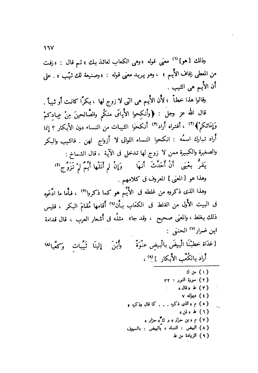 وهذا الذي ذكروه من غلطه في الأيم هو كما ذكروه، فأما ما ادعوه في البيت الأول من الغلط في الكعاب بأن أقامها مقام البكر فليس ذلك بغلط، والمعنى صحيح، وقد جاء مثله في أشعار العرب، قال قدامة بن ضرار الحنفى: