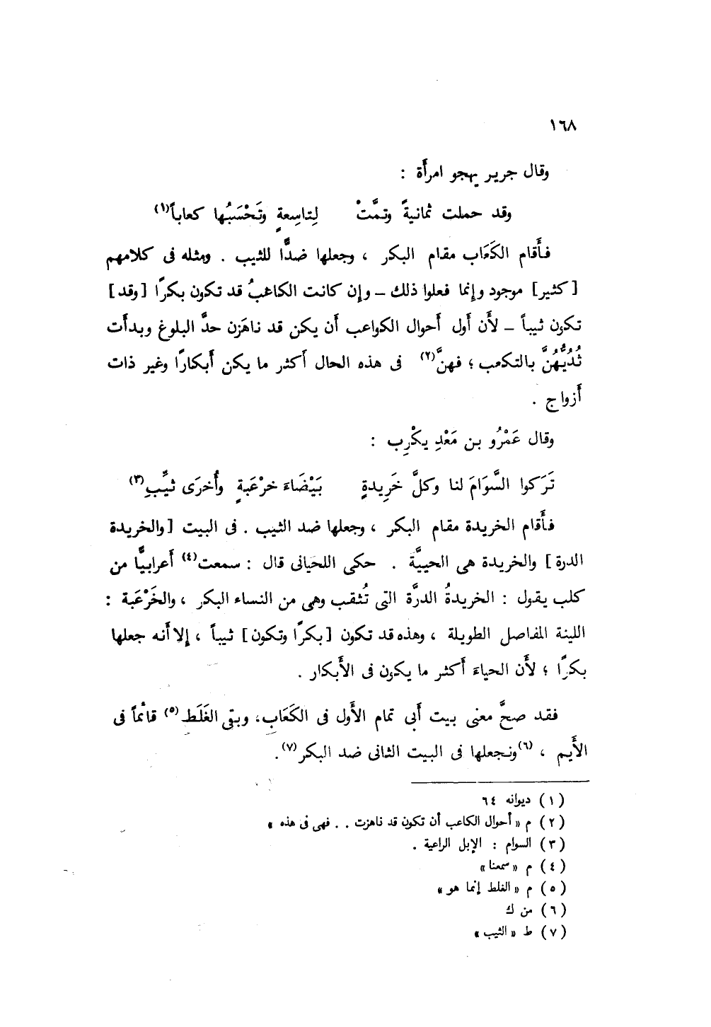 فأقام الكعاب مقام البكر، وجعلها ضد الثيب، ومثله في كلامهم كثير موجود، فعلوا ذلك - وإن كان الكاعب قد تكون بكراً وتكون ثيباً - لأن أول أحوال الكواعب أن يكن قد ناهزن حد البلوغ، وبدت ثديهن بالتكعيب؛ فهن في هذه الحال أكثر ما يكن أبكاراً وغير ذات أزواج، قال عمرو ابن معد يكرب: