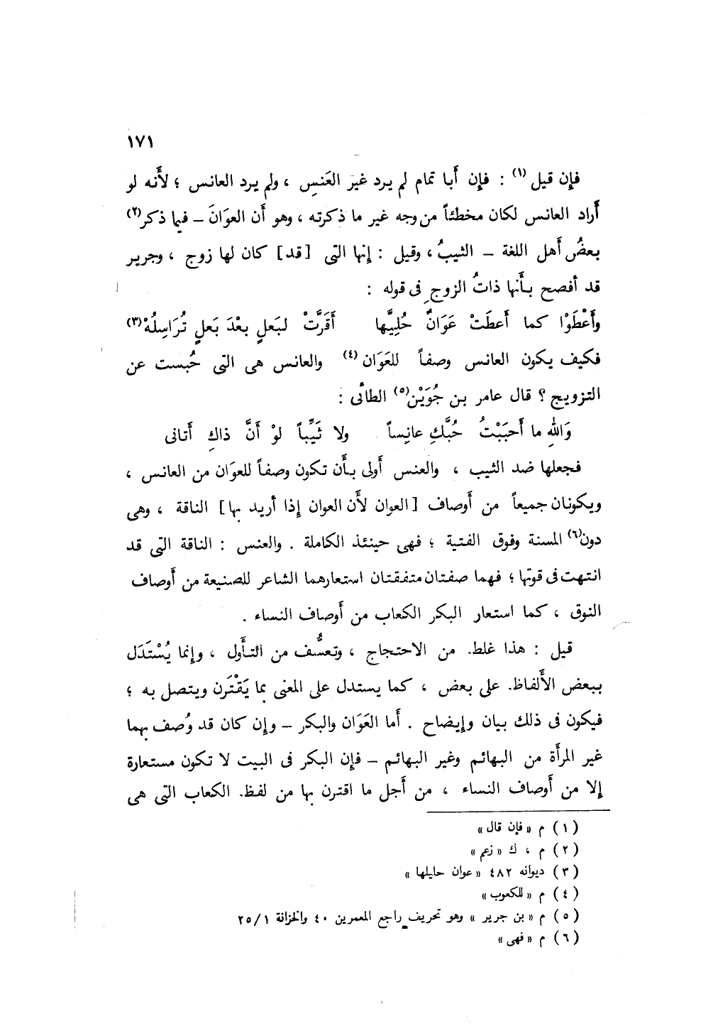 فإن قيل: إن أبا تمام لم يرد غير العنس، ولم يرد العانس؛ لأنه لو أراد العانس لكان مخطئاً من وجهٍ غير الذي ذكرته، وهو أن العوان - فيما ذكر بعض أهل اللغة - الثيب، وقيل: إنها التي كان لها زوج، وجرير قد أفصح أنها ذات الزوج في قوله: