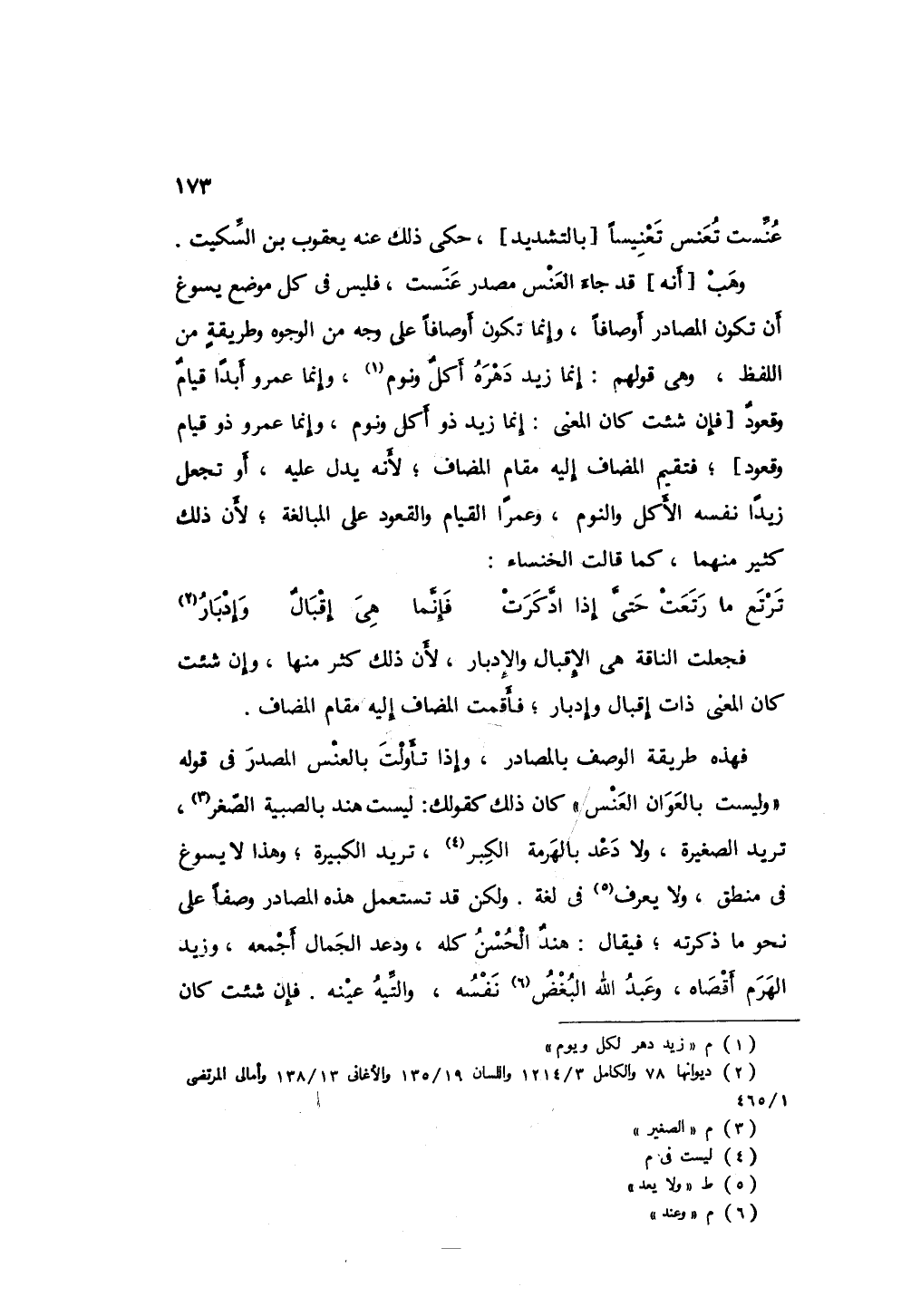 فجعلت الناقة هي الإدبار والإقبال لأن ذلك كثر منها، وإن شئت كان المعنى ذات إقبال وإدبار، فأقمت المضاف إليه مقام المضاف؛ فهذه طريقة الوصف بالمصادر، وإذا تأولت بالعنس المصدر في قوله " وليست بالعوان العنس " كان ذلك كقولك: ليست هند بالصبية الصغر، تريد الصغيرة، ولا دعد بالهرمة الكبر، تريد الكبيرة؛ فهذا لا يسوغ في منطق ولا يعرف في لغة، ولكن قد تستعمل هذه المصادر وصفاً على نحو ماذكرته؛ فيقال هند الحسن كله، ودعد الجمال أجمعه، وزيد الهرم أقصاه، وعبد الله البغض نفسه، والتينة عينه، وإن شئت كان