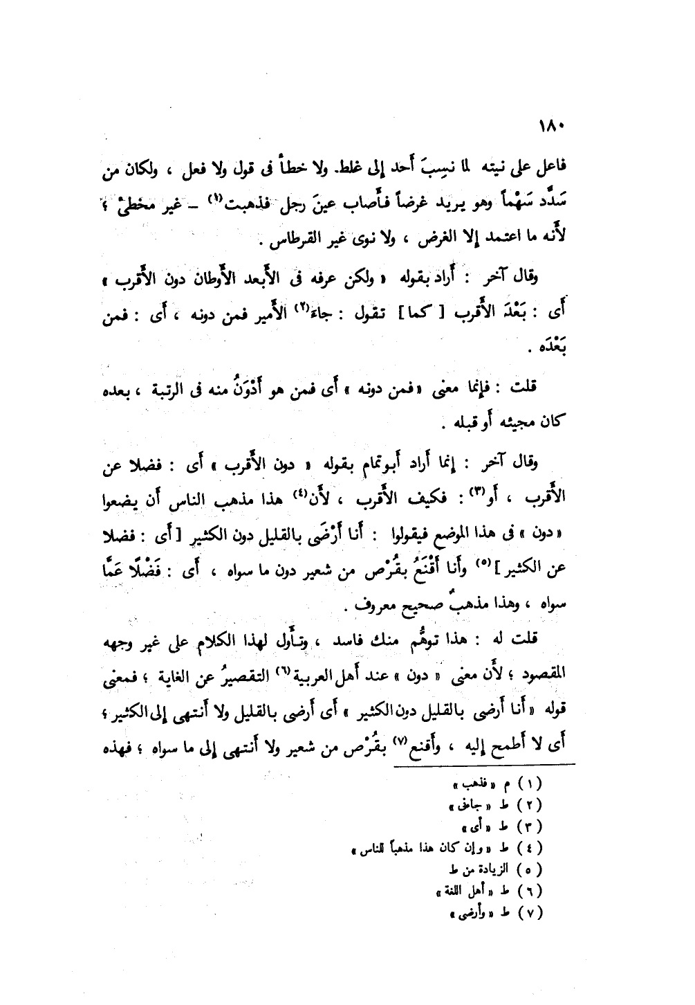 وقال آخر: إنما أراد أبو تمام بقوله " دون الأقرب " أي: فضلاً عن الأقرب أو: فكيف الأقرب؛ لأن هذا مذهبٌ للناس: أن يضعوا " دون " في هذا الموضع فيقولوا: أنا أرضى بالقليل دون الكثير، أي: فضلا عن الكثير، وأنا أقنع بقرصٍ من شعير دون ما سواه، أي فضلاً عما سواه، وهذا مذهبٌ صحيح معروف.