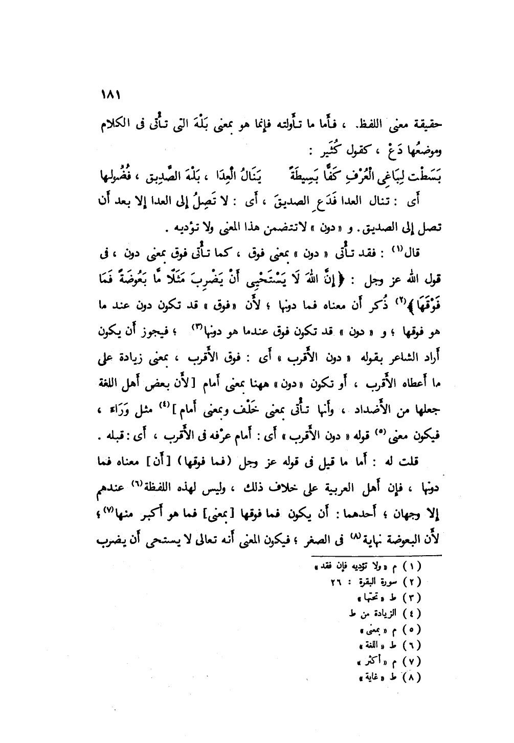 قلت له: أما ما قيل فىقوله عز وجل (فما فوقها) معناه فما دونها فان أهل العربية على خلاف ذلك وليس لهذه اللغة عندهم ألا وجهان: أحدهما: أن يكون (فما فوقها) بمعنى فما هو أكبرمنها لأن البعوضة غاية فى الصغر فيكون المعنى أنه عز وجل لا يستحى أن يضرب