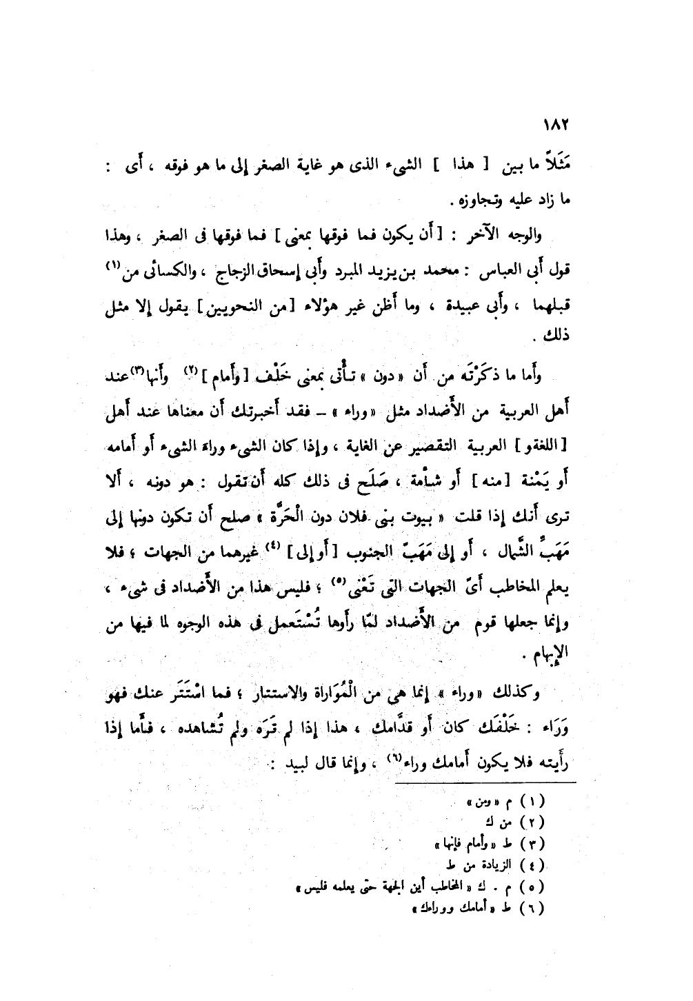 وأما ما ذكرت من أن دون تأتي بمعنى خلف وأمام، وأنها عند أهل العربية من الأضداد نحو " وراء " فقد أخبرتك أن معناها عند أهل العربية التقصير عن الغاية، وإذا كان الشيء وراء الشيء أو أمامه أو يمنة منه أو شأمة صلح في ذلك كله أن تقول: هو دونه، ألا ترى أنك إذا قلت " بيوت بني فلان دون الحرة "، صلح أن تكون دونها إلى مهب الشمال، أو إلى مهب الجنوب، أو إلى غيرهما من الجهات؛ فلا يعلم المخاطب أي الجهات التي تعنى، فليس هذا من الأضداد في شيء، وإنما جعلها قوم من الأضداد لما رأوها تستعمل في هذه الوجوه لما فيها من الإبهام، وكذلك " وراء " إنما هي من المواراة والاستتار؛ فما استتر عنك فهو وراء: خلفك كان أو قدامك، هذا إذا لم تره ولم تشاهده، وأما إذا رأيته فلا يكون أمامك ووراءك، وإنما قال لبيد: