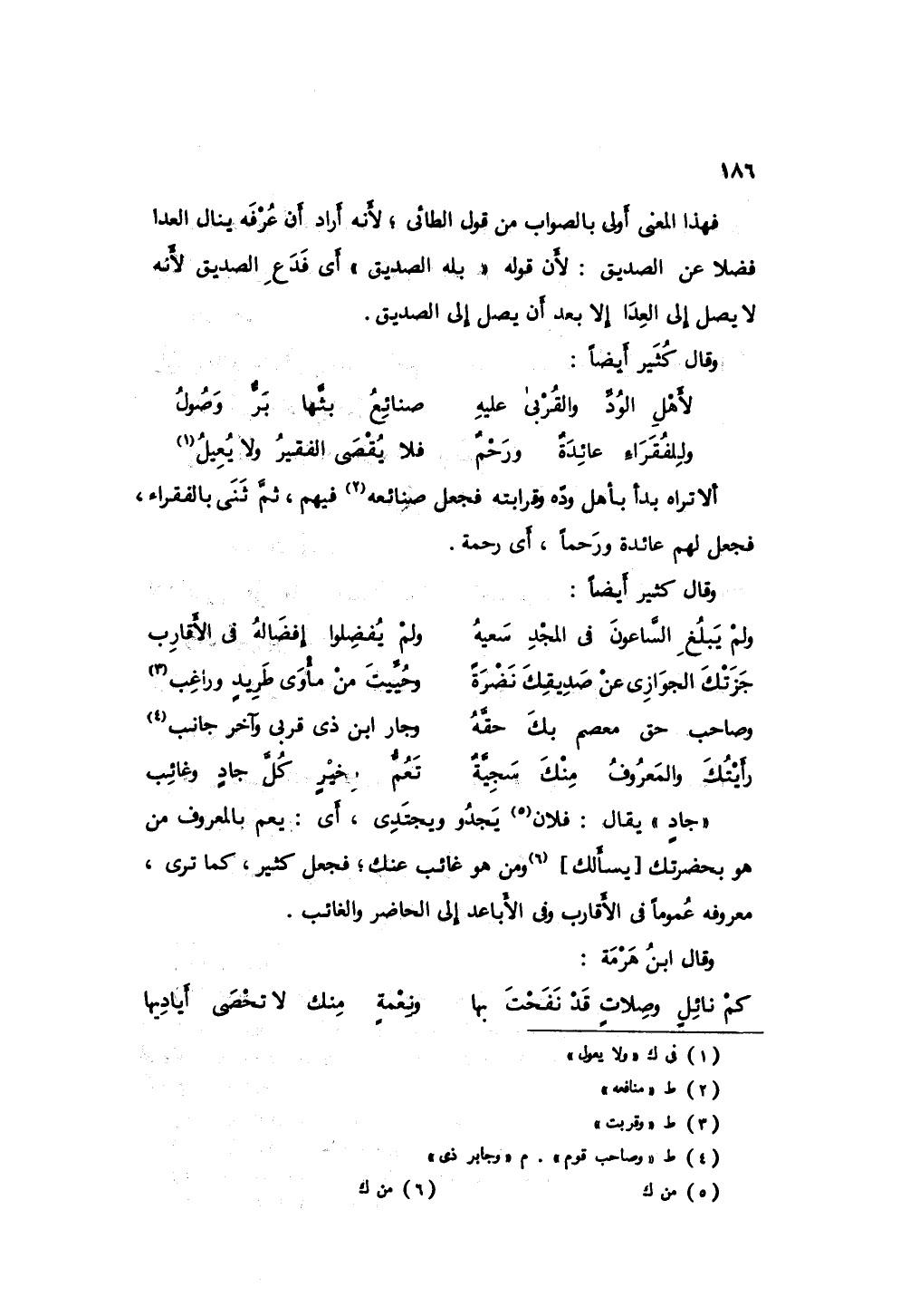 ألا تراه بدأ بأهل وده وقرابته فجعل صنائعه فيهم، ثم ثنى بالفقراء فجعل لهم عائدة ورحما: أي رحمة؟ وقال كثير أيضاً: