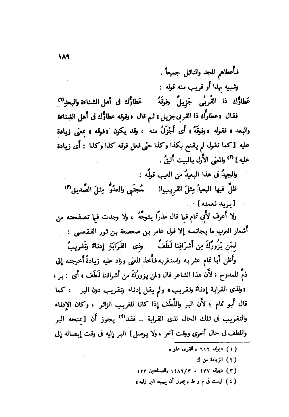 وأطن أبا تمام عثر به واستغر به فأخذ المعنى وزاد عليه زيادةً أخرجته إلى ذم الممدوح؛ لأن هذا الشاعر قال " لمن يزورك من أشارفنا لطفٌ " أي: بر، " ولذى القرابة إدناء وتقريب " ولم يقل إدناء وتقريب دون البر، كما قال أبو تمام؛ لأن البر واللطف إذا كانا للغريب الزائر، وكان الإدناء والتقريب في تلك الحال لذى القرابة - فقد يجوز أن يمنحه البر واللطف في حالٍ أخرى ووقت آخر، ولا يوصل البر إليه في وقت إيصاله إلى
