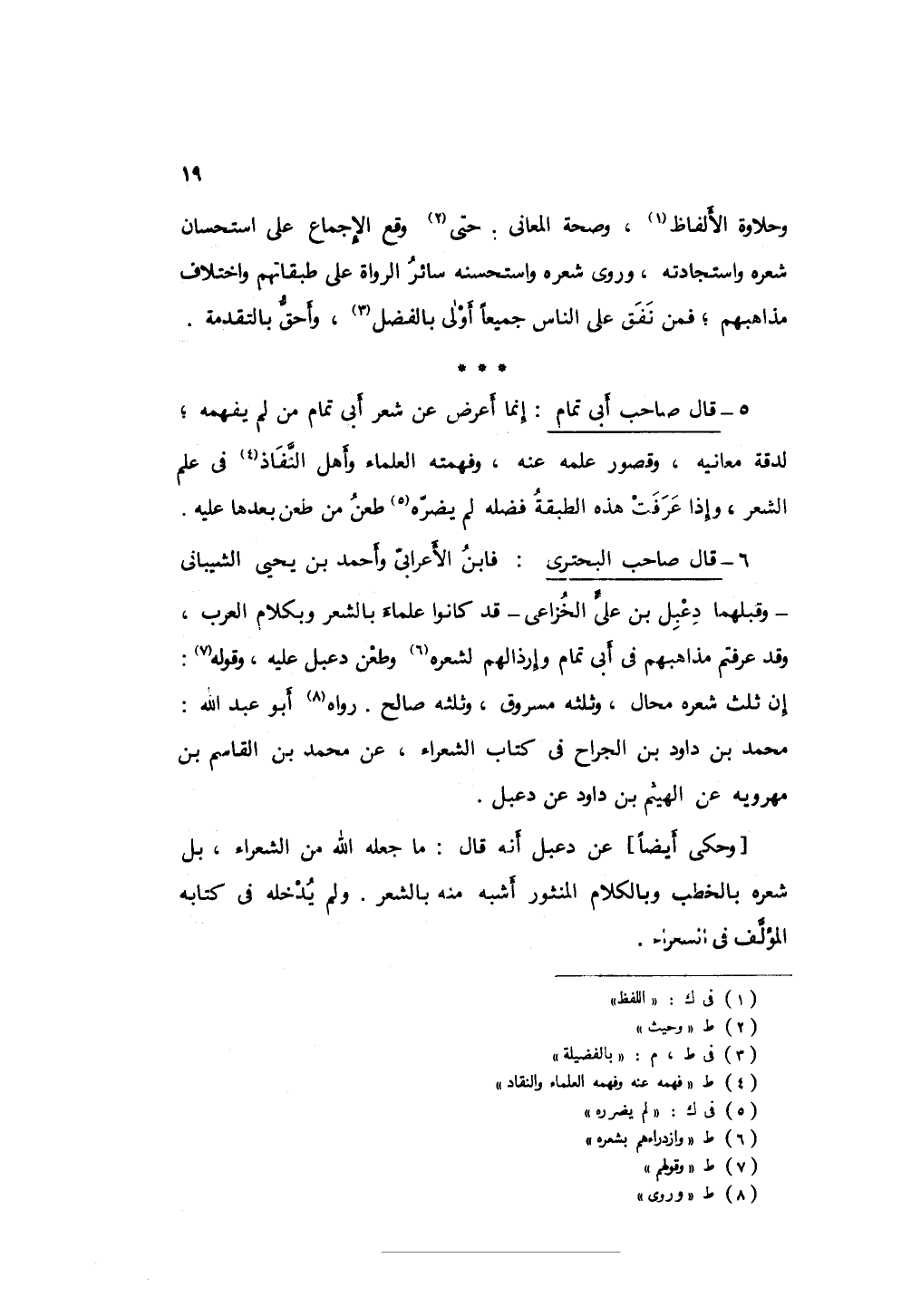 6 - قال صاحب البحتري: إن ابن الأعرابي وأحمد بن يحيى الشيباني - وقبلهما دعبل بن علي الخزاعي - قد كانوا علماء بالشعر وكلام العرب، وقد علمتم مذاهبهم في أبي تمام، وازدراءهم بشعره، وطعن دعبل عليه، وقوله: إن ثلث شعره محالن وثلثه مسروق، وثلثه صالح. وروى أبو عبد الله محمد بن داةد بن الجراح في كتاب الشعراء عن محمد بن القاسم بن مهرويه عن الهيثم بن داود عن دعبل أنه قال: ما جعله الله من الشعراء، بل شعره بالخطب والكلام المنثور أشبه منه بالشعر، ولم يدخله في كتابه المؤلف في الشعراء.