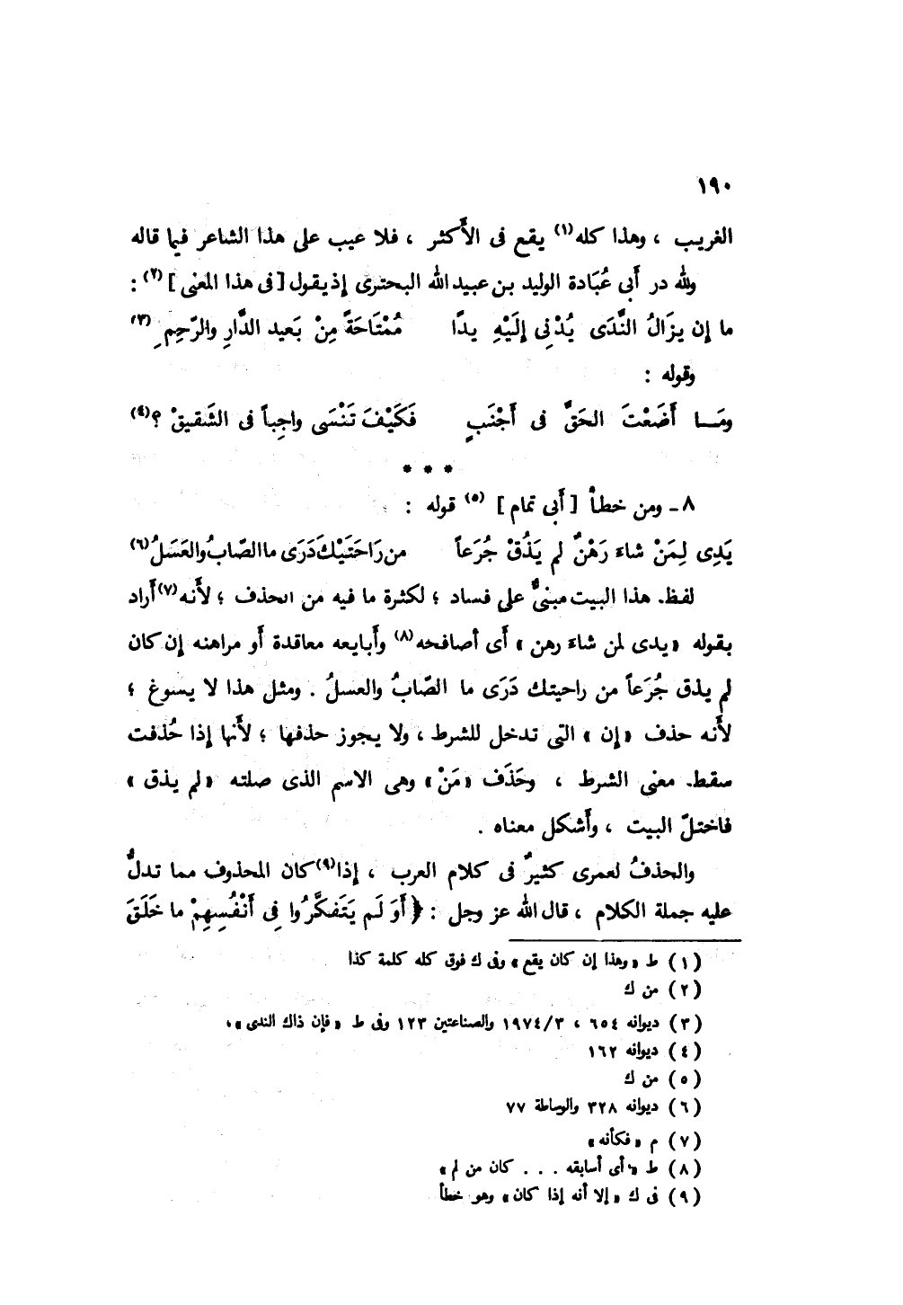 لفظ هذا البيت مبنيٌ على فساد؛ لكثرة ما فيه من الحذف؛ فكأنه أراد بقوله " يدي لمن شاء رهن " أي: أصافحه وأبايعه معاقدةً أو مراهنة إن كان من لم يذق جرعاً من راحتيك درى ما الصاب والعسل، ومثل هذا لا يسوغ؛ لأنه حذف " إن " التي تدخل للشرط، ولا يجوز حذفها؛ لأنها إذا حذفت سقط معنى الشرط، وحذف " من " وهي الاسم الذي صلته " لم يذق " فاختل البيت، وأشكل معناه.
