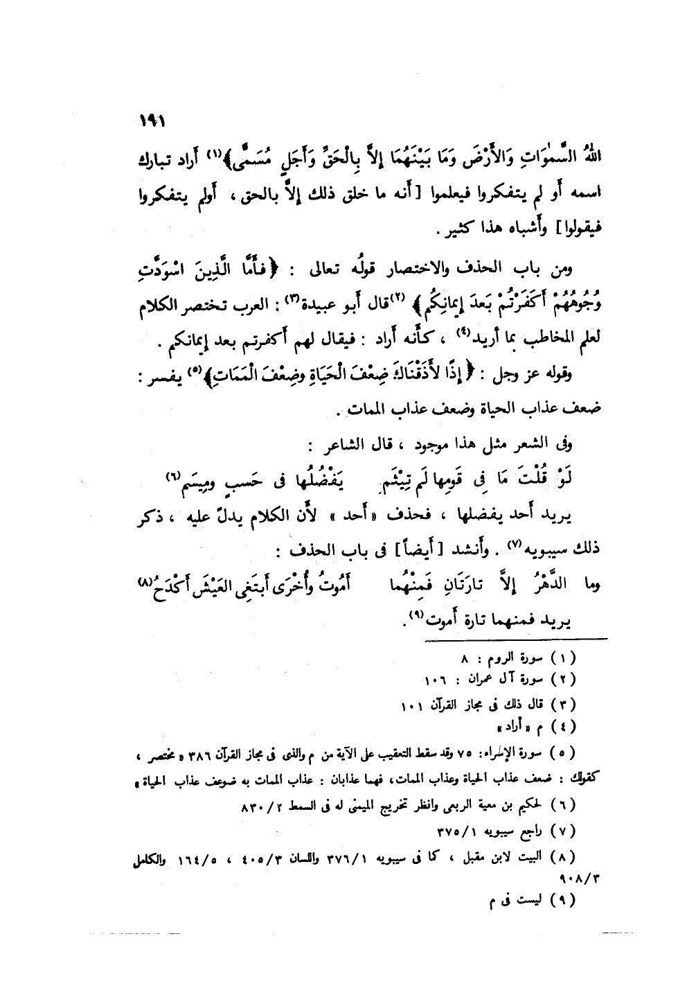 قال أبو عبيدة: العرب تختصر الكلام لعلم المخاطب بما أريد، كأنه أراد فيقال لهم: أكفرتم بعد إيمانكم، وقوله عز وجل: " إذاً لأذقناك ضعف الحياة وضعف الممات " يفسر ضعف عذاب الحياة وضعف عذاب الممات، وفي الشعر مثل هذا موجود، قال الشاعر: