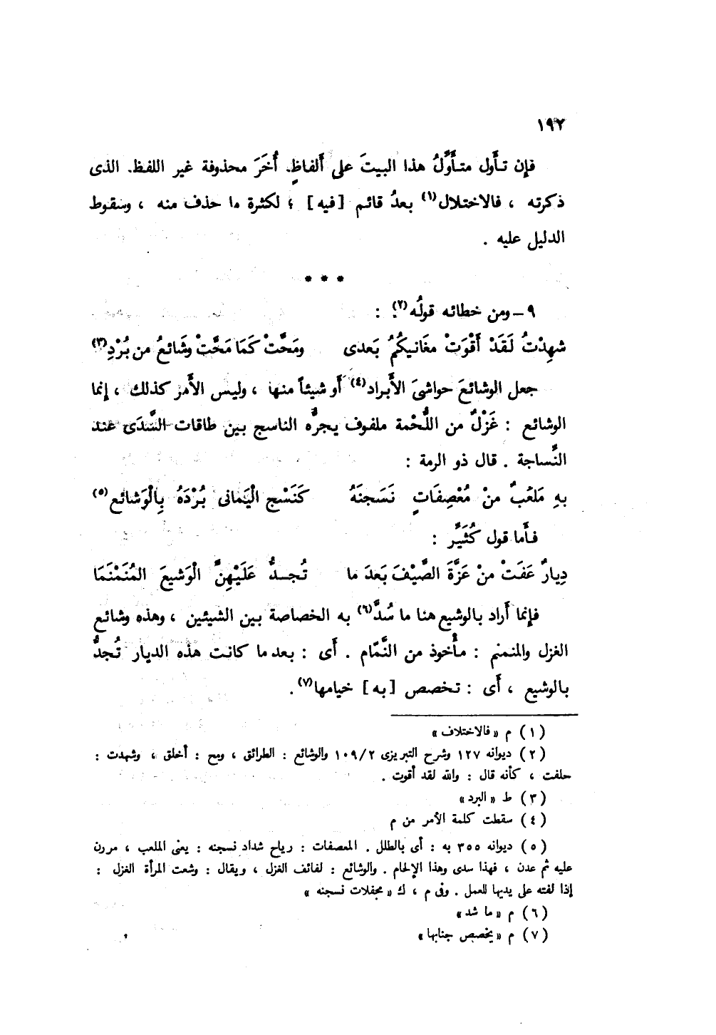 فإنما أراد بالوشيع هنا سد به الخصائص بين الشيئين، وهو من وشائع الغزل مأخوذ، والمنمنم: مأخوذ من النمام، أي بعد ما كانت هذه الديار تجد بالوشيع، أي: يخصص به خيامها.