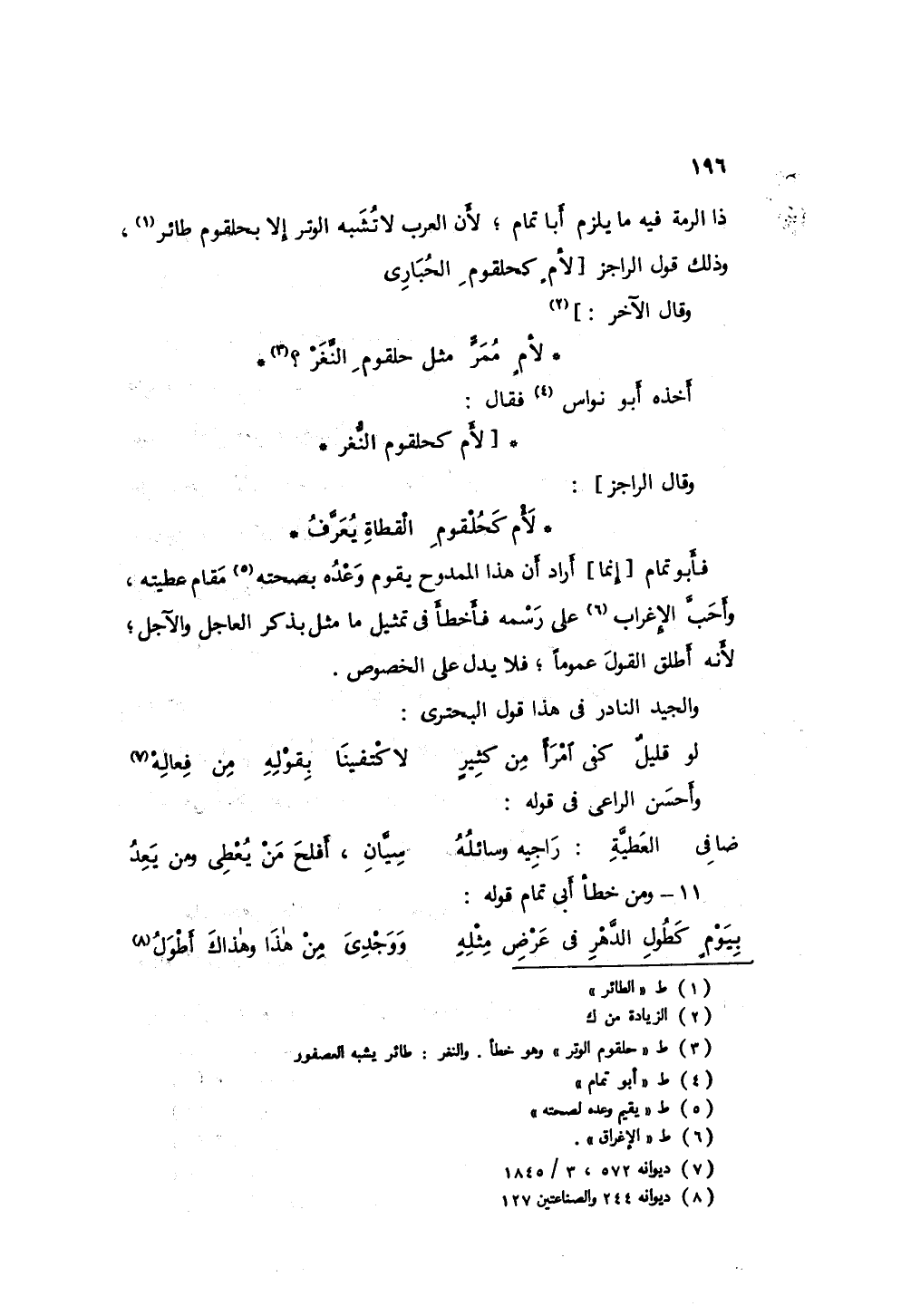 وقال الراجز: لأم كحلقوم القطاة تغترف وأبو تمام إنما أراد أن هذا الممدوح يقيم وعده لصحته مقام عطيته، وأحب الإغراق على رسمه فأخطأ في تمثيل ما مثل بذكر العاجل والآجل؛ لأنه أطلق القوم عموماً لا يدل على الخصوص.