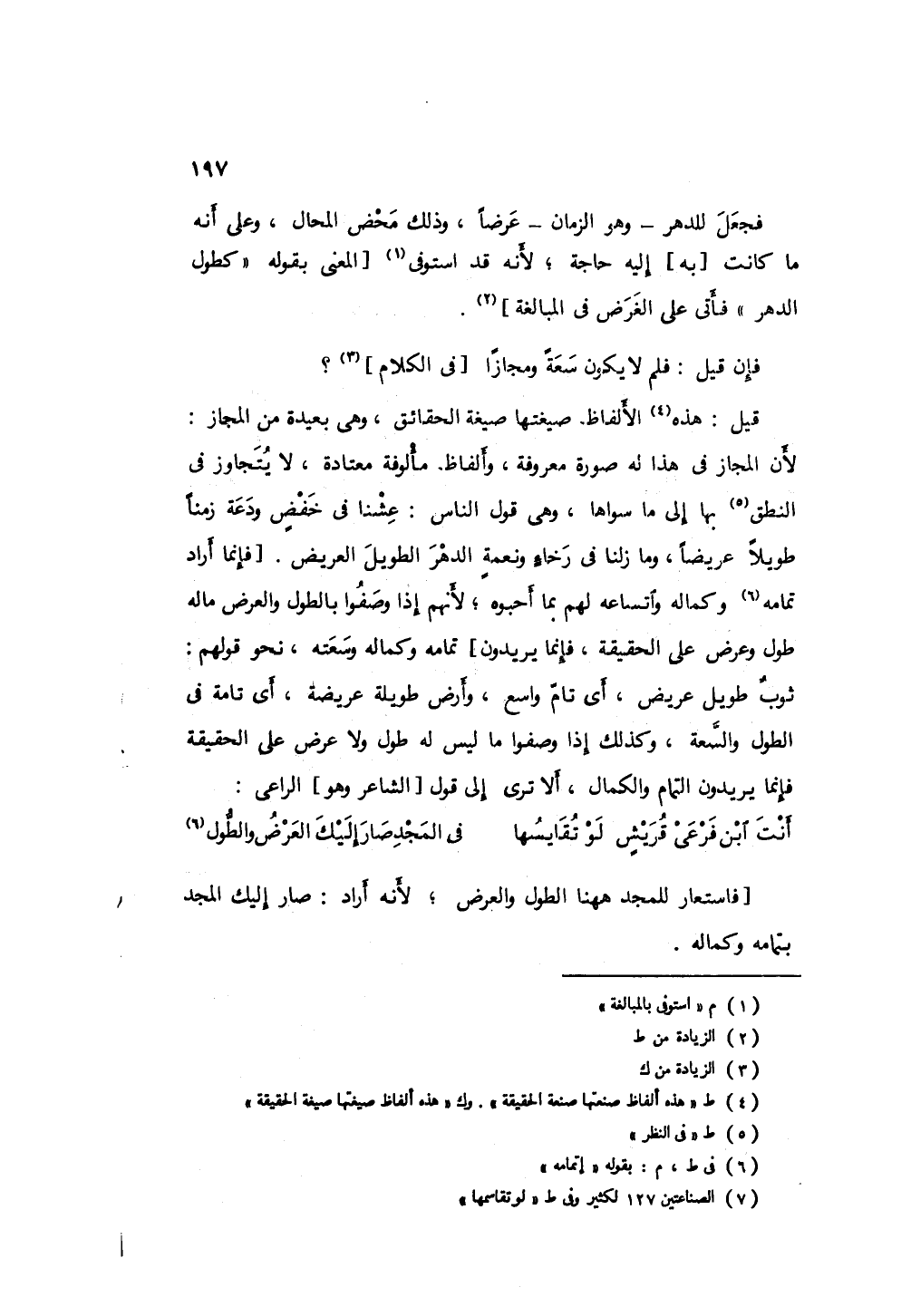 فإن قيل: فلم لا يكون سعةً ومجازا؟ قيل: هذه ألفاظ صنعتها صنعة الحقيقة، وهي بعيدة من المجاز؛ لأن المجاز في هذا له صورة معروفة، وألفاظ مألوفة معتادة، لا يتجاوز في النطق بها إلى ما سواها، وهي قول الناس: عشنا في خفض ودعة زماناً طويلا عريضاً، وما زلنا في رخاء ونعمةٍ الدهر الطويل العريض. وإنما أرادوا إتمامه وكماله واتساعه لهم بما أحبوه؛ لأنهم إذا وصفوا بالطول والعرض ماله طول وعرضٌ على الحقيقة فإنما يريدون تمامه وكماله وسعته، نحو قولهم: ثوبٌ طويل عريض، أي: تام واسع، وأرض طويلة عريضة، أي: تامة في الطول والسعة، وكذلك إا وصفوا ما ليس له طول ولا عرض على الحقيقة فإنما يريدون التمام والكمال، ألا ترى إلى قول الراعي: