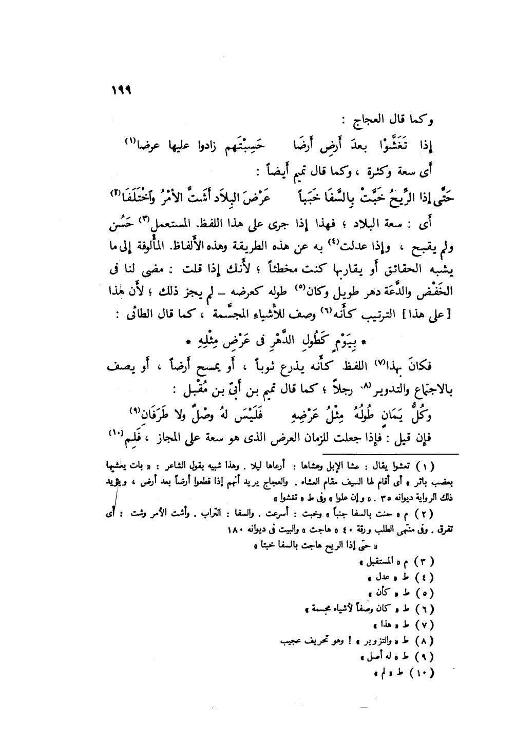 أي: سعة البلاد؛ فهذا إذا جري على هذا اللفظ المستعمل حسن ولم يقبح، وإذا عدلت به عن هذه الطريقة وهذه الألفاظ المألوفة إلى ما يشبه الحقائق أو يقاربها كنت مخطئاً؛ لأنك إذا قلت: " مضى لنا في الخفض والدعة دهرٌ طويل كأن طوله كعرضه " لم يجز ذلك؛ لأن هذا على هذا الترتيب كأنه وصفٌ لأشياء مجسمة، كما قال الطائي: